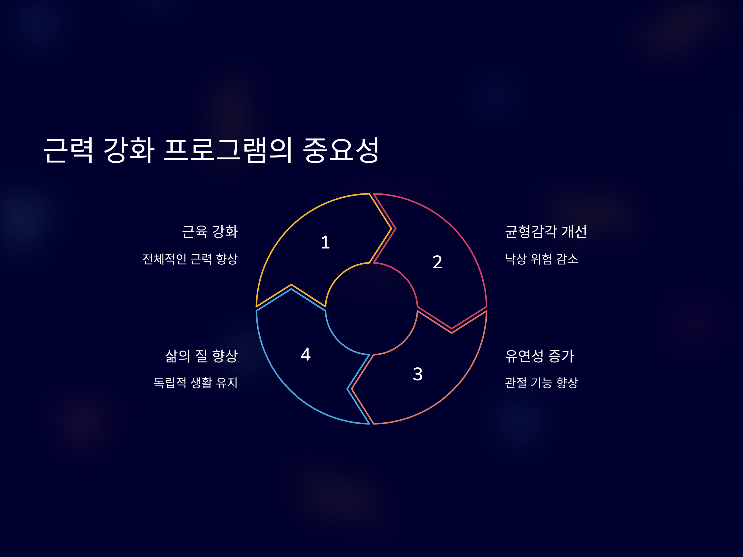근력 강화 프로그램은 체중을 실어주는 운동, 저항 훈련, 그리고 일상에서 쉽게 할 수 있는 운동들이 포함됩니다. 이는 전문가의 지도 하에 시작하는 것이 가장 좋으며, 운동 강도는 점차적으로 늘려가며 몸에 무리가 가지 않도록 조절해야 합니다.