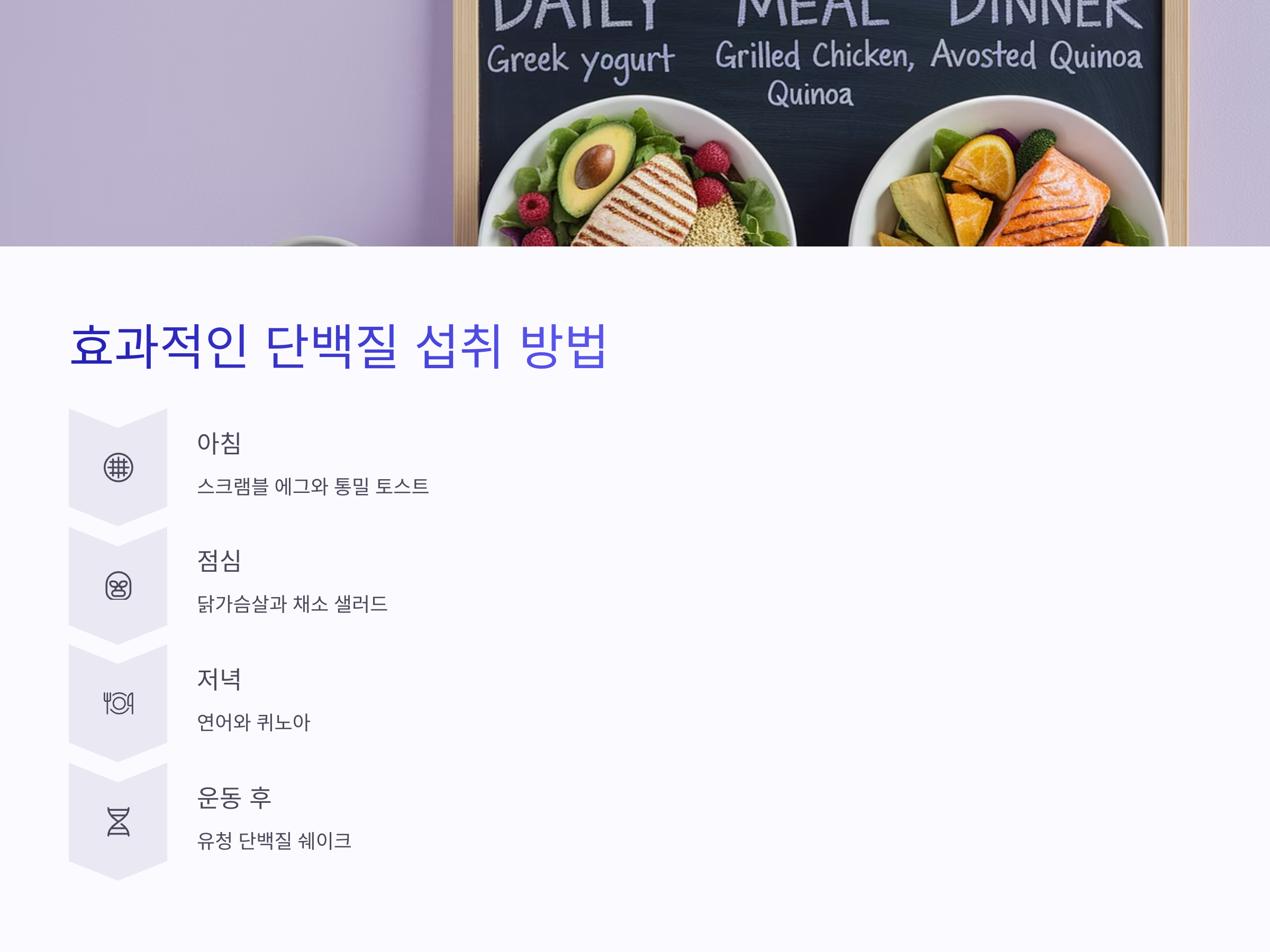 예를 들어, 아침에는 스크램블 에그와 함께 통밀 토스트, 점심에는 닭가슴살과 채소 샐러드를 먹고, 저녁에는 연어와 퀴노아를 포함한 식사를 준비하는 방식입니다. 또한, 운동 후에는 유청 단백질 쉐이크를 섭취하여 근육 회복을 돕는 것도 좋은 방법입니다.