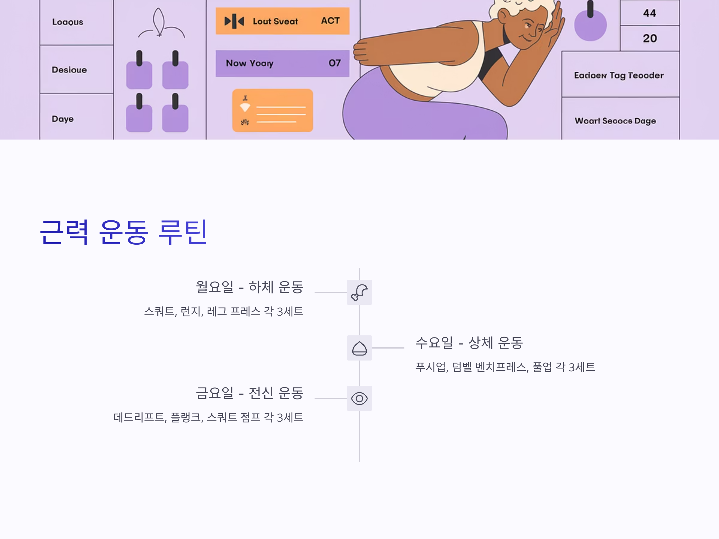 근력 운동을 시작하려면 적절한 운동 루틴을 따르는 것이 중요합니다. 초보자는 먼저 자신의 체력에 맞는 기본적인 운동부터 시작하여 점차적으로 운동 강도와 빈도를 늘려가는 것이 좋습니다. 아래는 일주일에 3~4일 정도 실시할 수 있는 근력 운동 루틴 예시입니다: