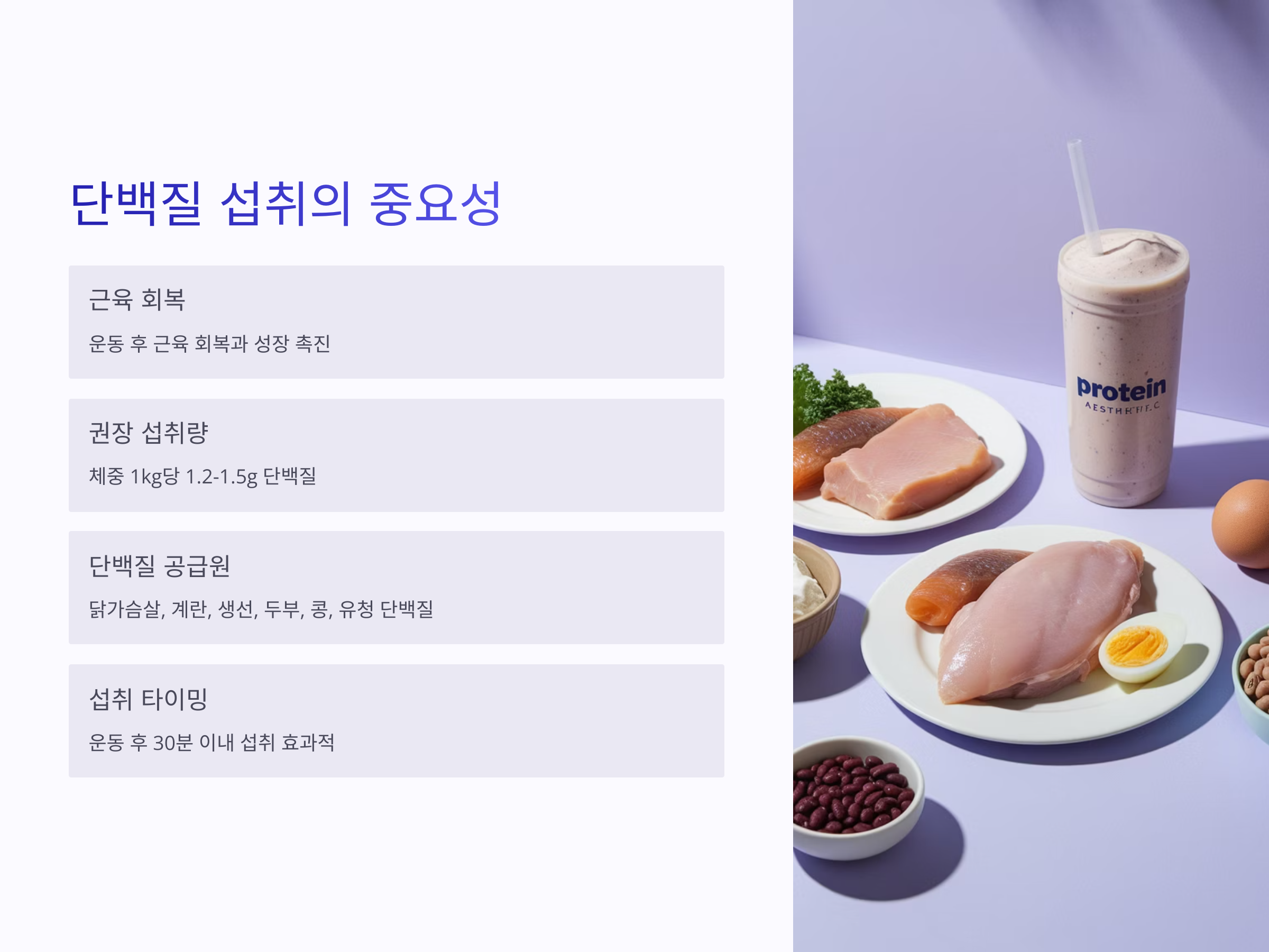 단백질을 섭취할 수 있는 좋은 식품으로는 닭가슴살, 계란, 생선, 두부, 콩, 유청 단백질 보충제 등이 있습니다. 특히, 운동 후 30분 이내에 단백질을 섭취하면 근육 회복에 더욱 효과적입니다.