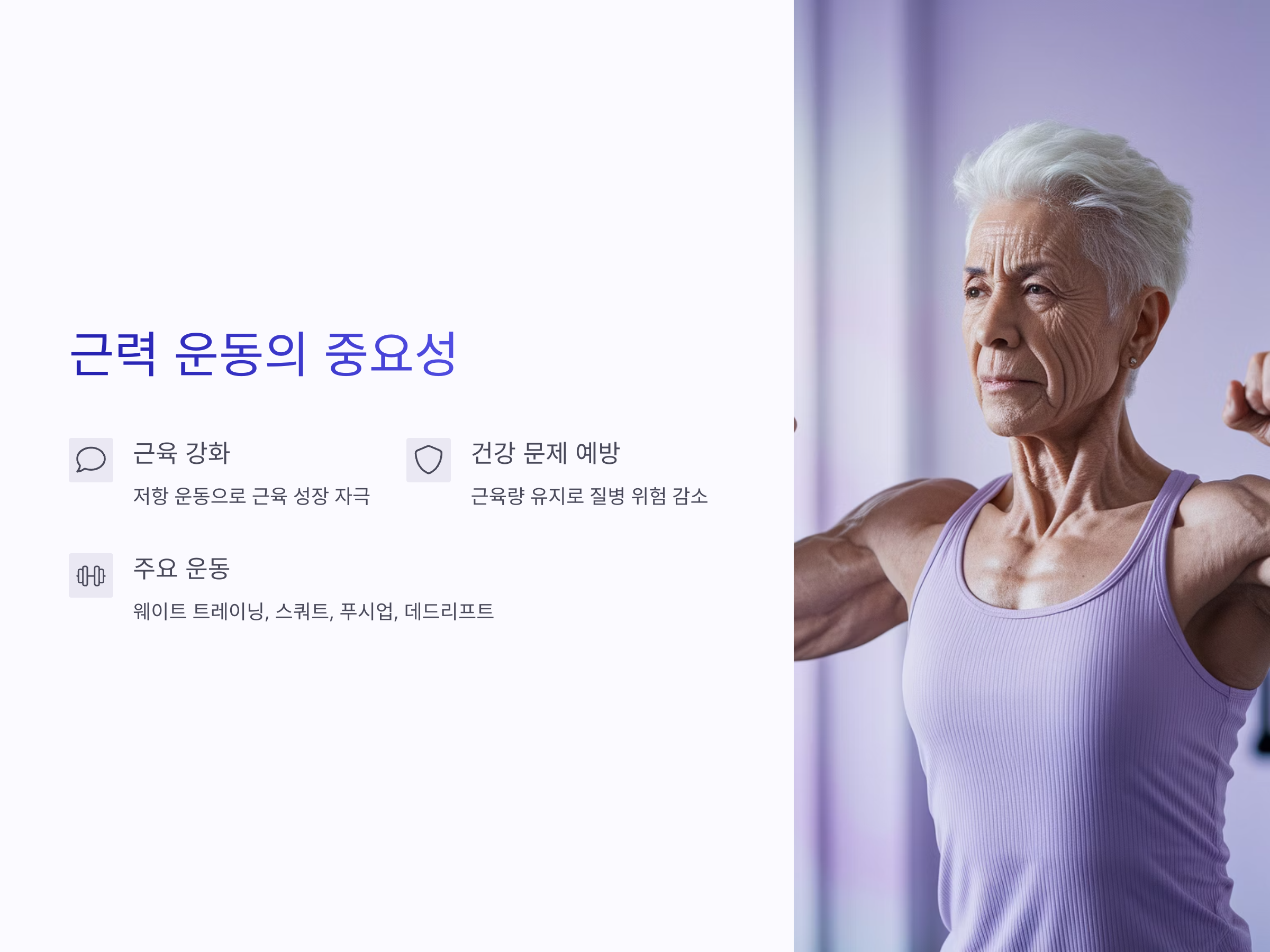 근력 운동은 근육을 강화하고 유지하는 가장 효과적인 방법입니다. 근육은 저항을 주는 운동을 통해 자극을 받아 성장하게 됩니다. 특히, 노화가 진행됨에 따라 근육량 감소가 두드러지기 때문에, 이를 방지하기 위한 꾸준한 근력 운동은 필수적입니다. 근력 운동을 통해 근육을 자극하면 근육량을 유지하거나 증가시킬 수 있으며, 이는 나이가 들면서 발생할 수 있는 여러 건강 문제를 예방하는 데에도 도움이 됩니다. 주요 근력 운동으로는 웨이트 트레이닝, 스쿼트, 푸시업, 데드리프트 등이 있습니다.
