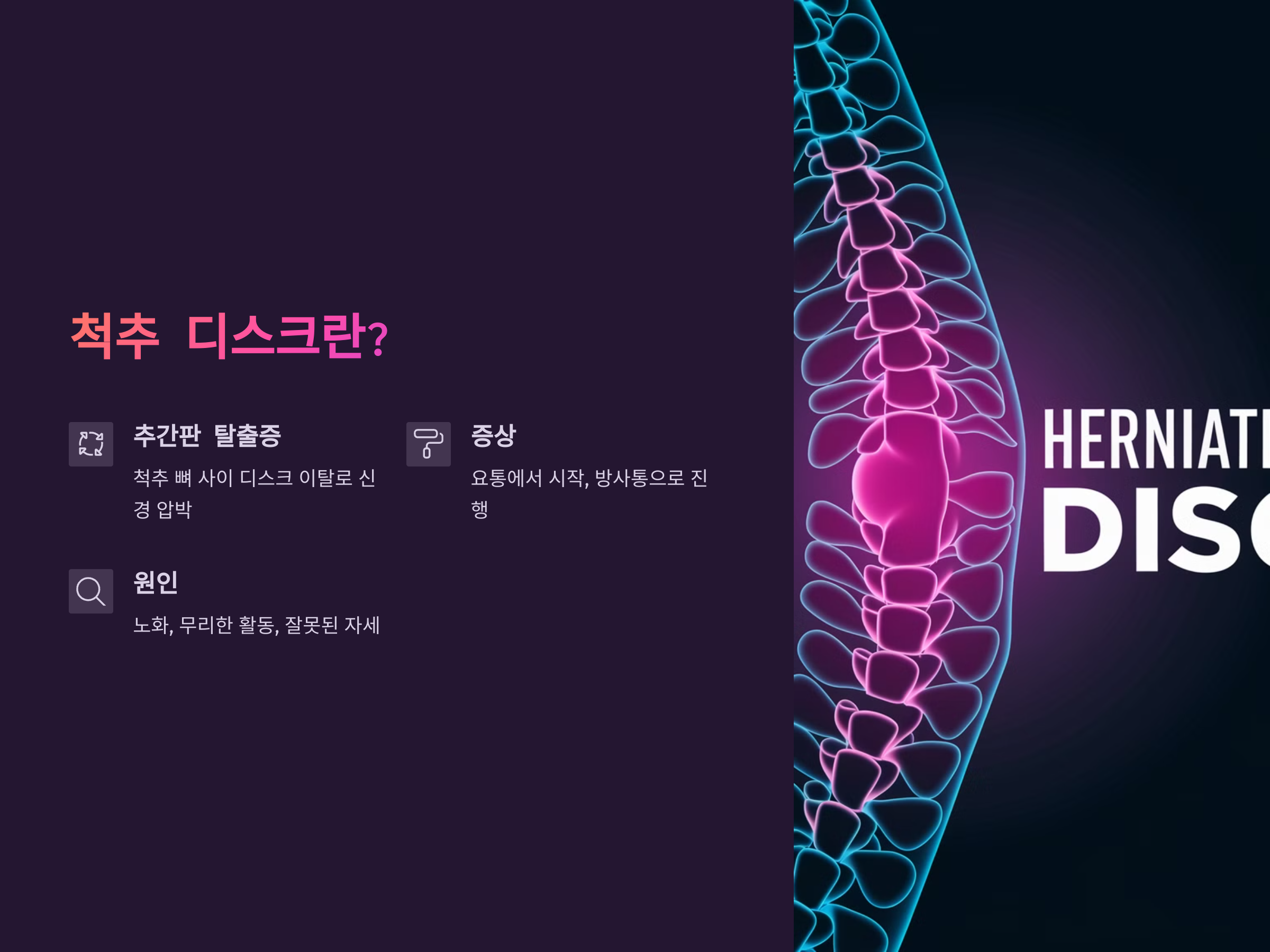 척추 디스크는 의학적으로 ‘추간판 탈출증’이라 불리며, 척추 뼈 사이에 있는 말랑한 디스크(추간판)가 제자리를 이탈해 신경을 압박하면서 통증이나 저림을 유발하는 질환입니다. 가장 흔하게 발생하는 부위는 허리(요추)와 목(경추)입니다. 초기에는 단순한 요통이나 목 통증으로 시작되지만, 신경이 눌리기 시작하면 다리나 팔로 퍼지는 방사통이 발생하게 됩니다.