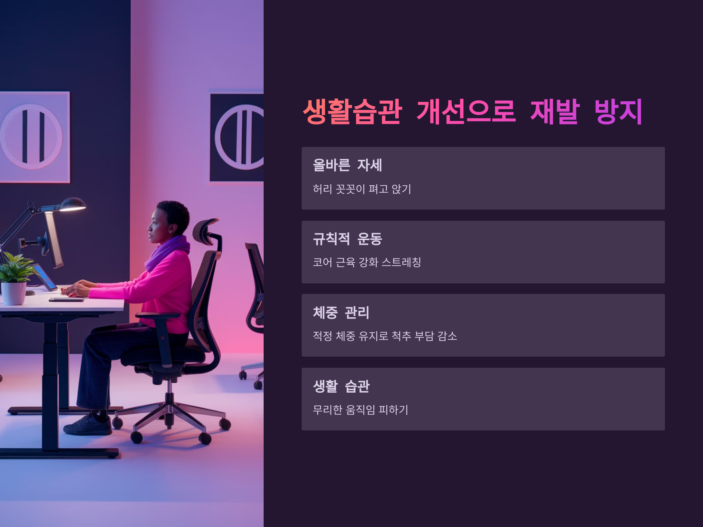 디스크 치료만큼 중요한 것이 바로 '예방'입니다. 치료 후에도 올바른 자세 유지, 규칙적인 운동, 적정 체중 유지 등 생활습관을 개선하지 않으면 재발 가능성이 매우 높습니다. 앉을 때는 허리를 꼿꼿이 펴고, 장시간 같은 자세는 피하며, 일상 속 스트레칭을 습관화하는 것이 좋습니다.