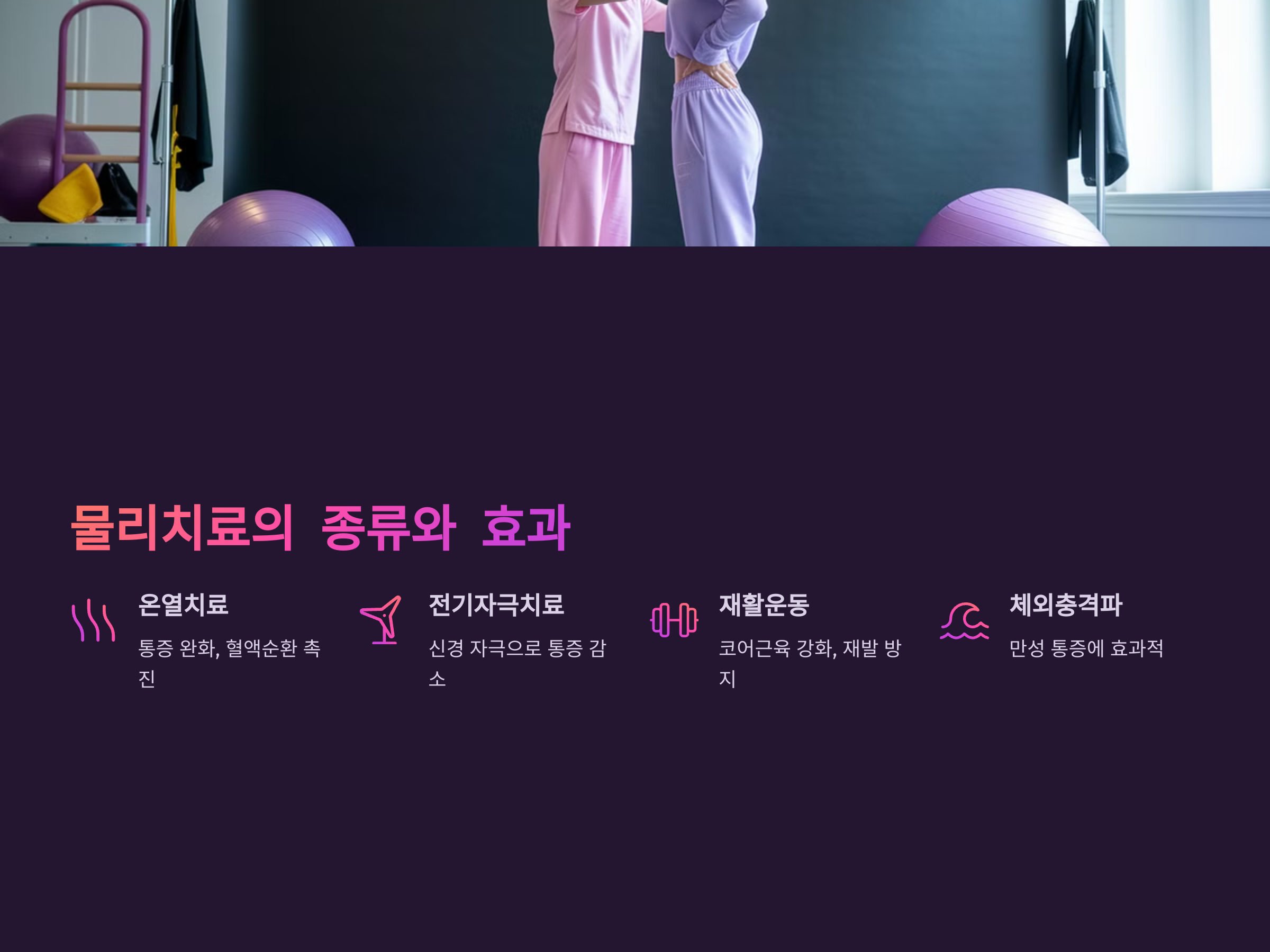 물리치료는 비수술적 치료 중 가장 일반적이면서도 효과적인 방법입니다. 흔히 알려진 온열치료, 전기자극치료(TENS), 초음파치료, 견인치료 외에도 최근에는 코어근육을 강화시켜 디스크 재발을 방지하는 재활운동 프로그램도 큰 인기를 끌고 있습니다. 치료 초기에 적용하면 통증을 빠르게 줄이고, 신체 기능 회복 속도를 높일 수 있습니다.