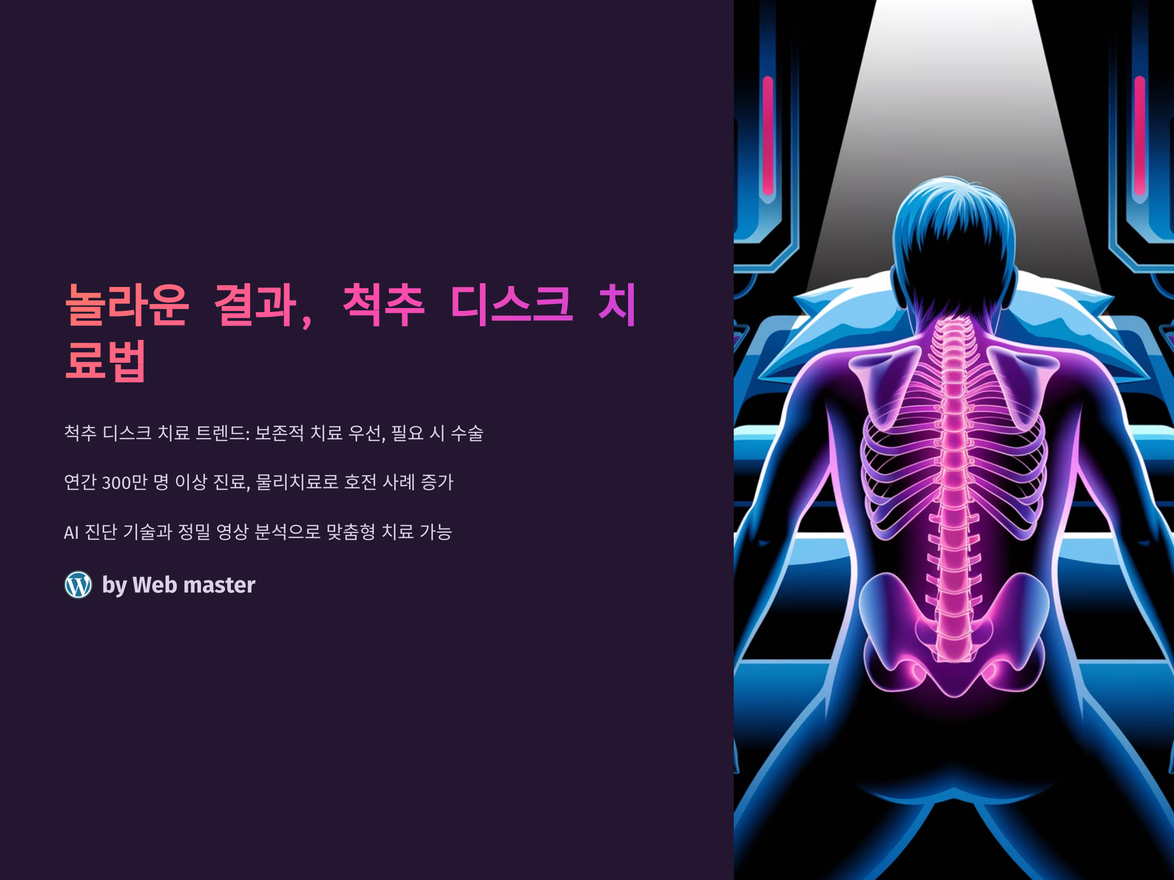 척추 디스크로 인한 고통은 한 번 겪어본 사람이라면 절대 가볍게 넘길 수 없습니다. 단순한 요통에서 시작해 다리 저림, 보행 불편, 심지어 마비 증세까지 진행될 수 있는 만큼 치료 방법 선택은 매우 중요합니다. 최근 들어 척추 질환의 치료 트렌드는 '보존적 치료 우선, 필요 시 수술'로 정리되고 있습니다. 건강보험심사평가원 자료에 따르면 2024년 한 해 동안만도 척추 질환 진료 환자는 300만 명 이상으로 증가했고, 그 중 상당수가 수술이 아닌 물리치료로 호전된 사례가 많았습니다.