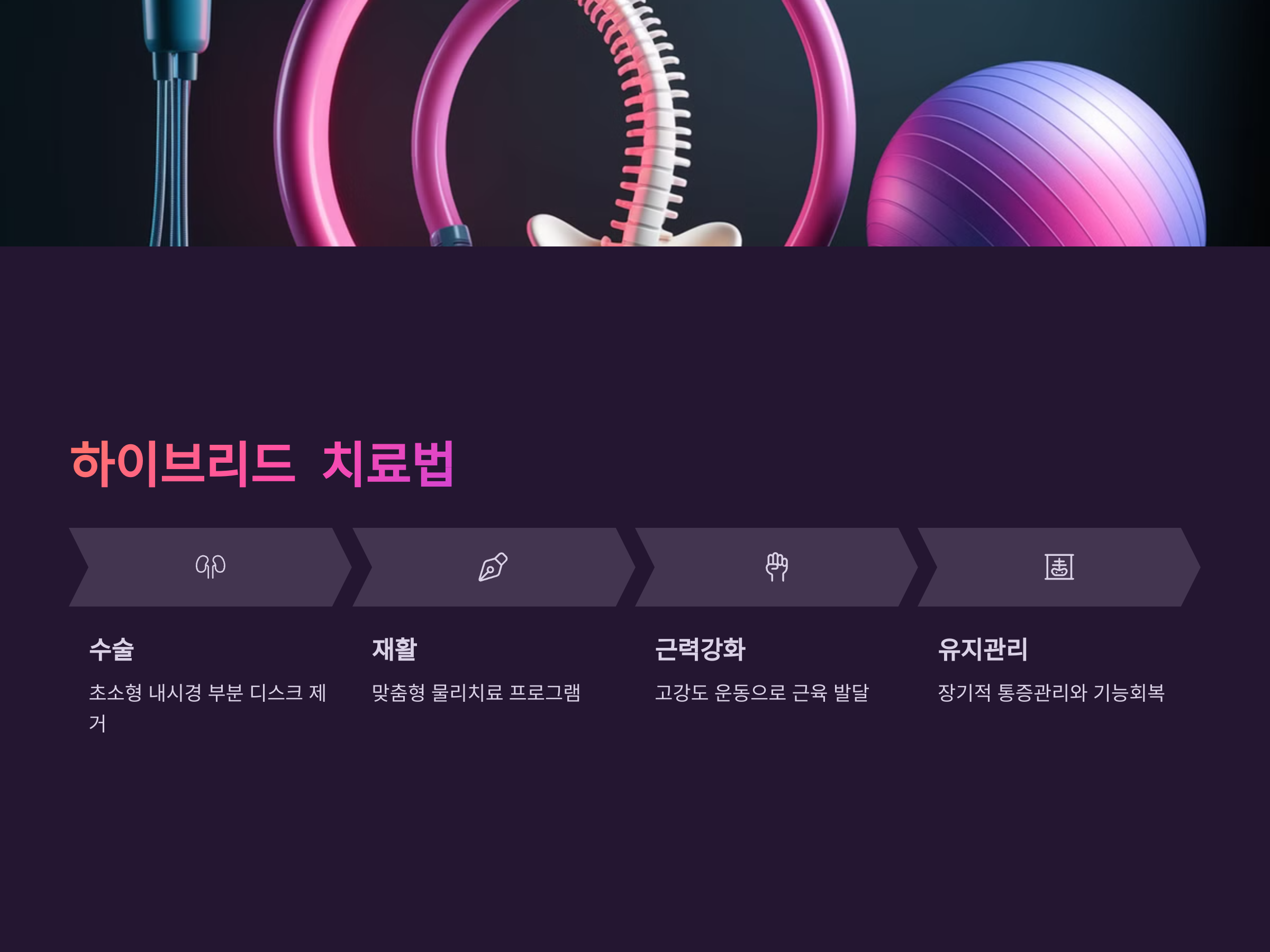 최근에는 수술과 물리치료의 장점을 결합한 하이브리드 치료법이 주목받고 있습니다. 예를 들어 디스크 수술 후 회복 단계에서 맞춤형 재활운동과 도수치료를 병행하면 재발률을 크게 낮출 수 있습니다. 또한 초소형 내시경을 통한 부분적 디스크 제거와 이후 고강도 근력운동을 연계한 치료 방식도 많은 병원에서 도입하고 있습니다.