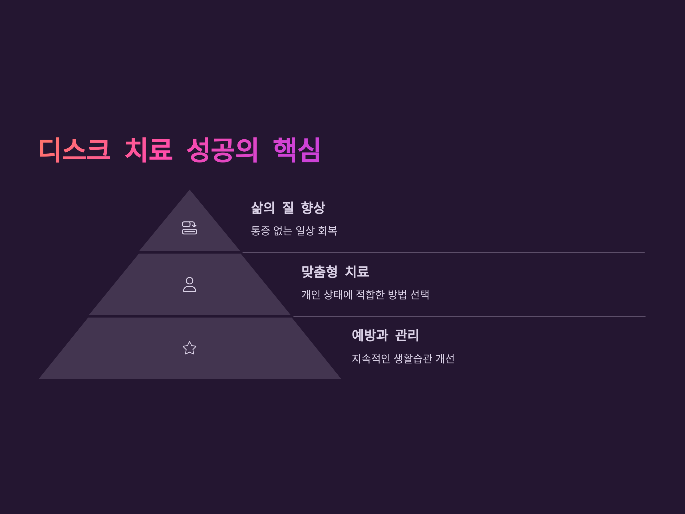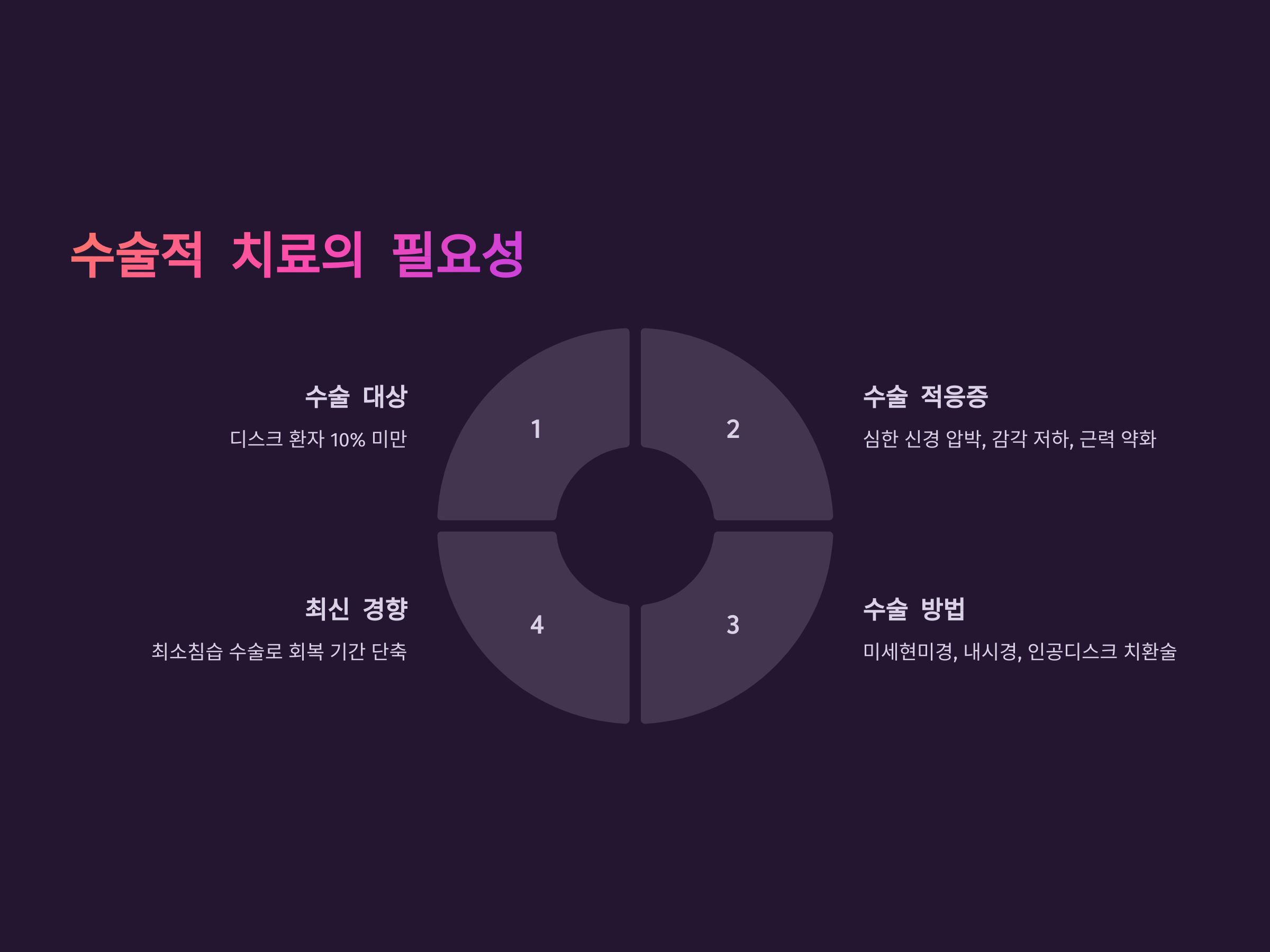 AI 진단 보조 기술과 정밀 영상 분석의 발전으로 디스크 진단 정확도가 향상되었고, 이에 따라 맞춤형 치료 선택도 가능해졌습니다. 의료 기술의 진보 덕분에 이제는 과거보다 훨씬 효과적인 물리치료 기법도 활용되고 있으며, 무조건적인 수술은 지양하는 추세입니다. 그럼에도 불구하고 특정 케이스에서는 수술이 반드시 필요한 경우도 있어, 정확한 판단과 의료진 상담이 필요합니다.