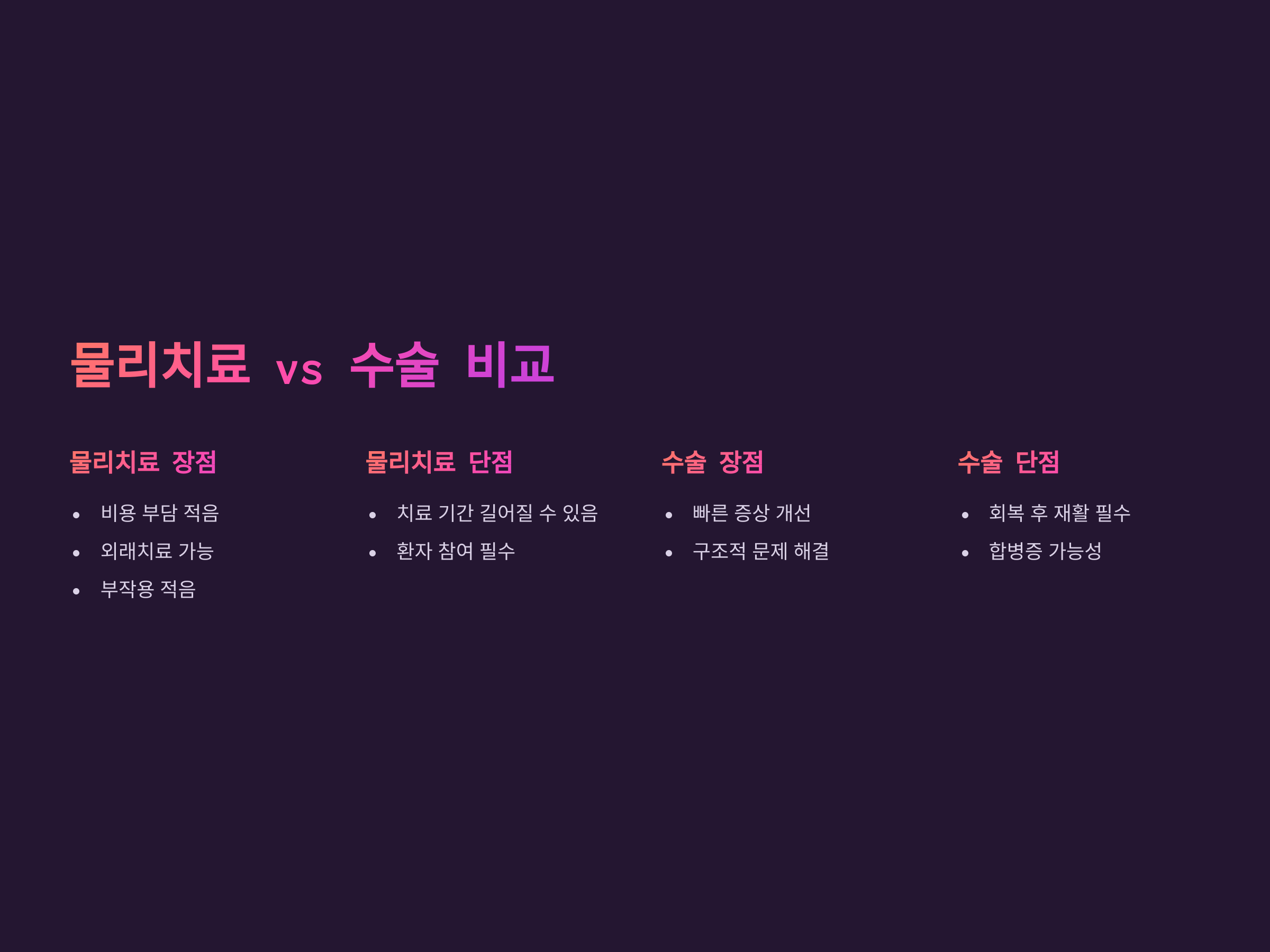 반면 수술은 빠른 증상 개선이 가능하지만, 회복 후 재활이 필수적이며 드물게 합병증이나 재수술 가능성도 존재합니다. 특히 반복적인 디스크 탈출이나 구조적 손상이 심한 경우에는 수술 외에 대안이 없을 수도 있습니다. 의료진과 충분한 상담을 통해 본인의 상태에 맞는 방법을 택하는 것이 핵심입니다.