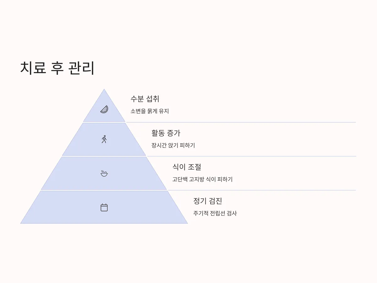 전립선 결석 치료 후에는 생활습관 개선이 필수입니다. 수분 섭취를 늘려 소변을 묽게 유지하고, 장시간 앉아 있는 습관을 줄이며, 규칙적인 배뇨를 실천하는 것이 좋습니다. 또한, 고단백 고지방 식이를 피하고 항산화 식품 위주의 균형 잡힌 식단이 도움이 됩니다.