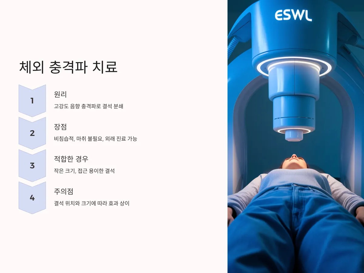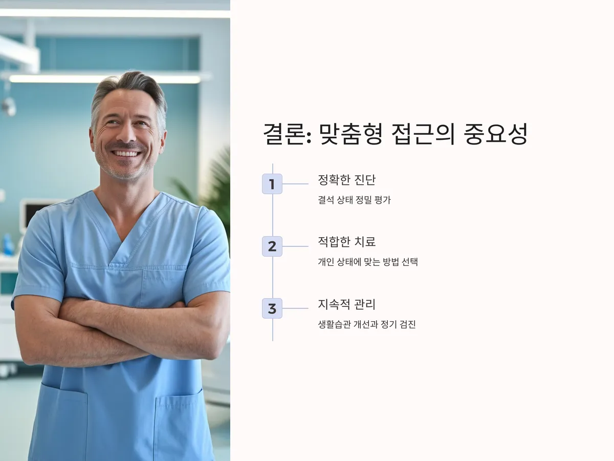 치료 방법은 개인의 건강 상태, 결석의 위치 및 크기, 동반 질환 등을 종합적으로 고려하여 결정해야 합니다. 단순히 '비침습적이니까 좋다' 혹은 '수술이 확실하다'는 판단보다는, 전문가와 상담 후 가장 적합한 치료법을 선택하는 것이 중요합니다.