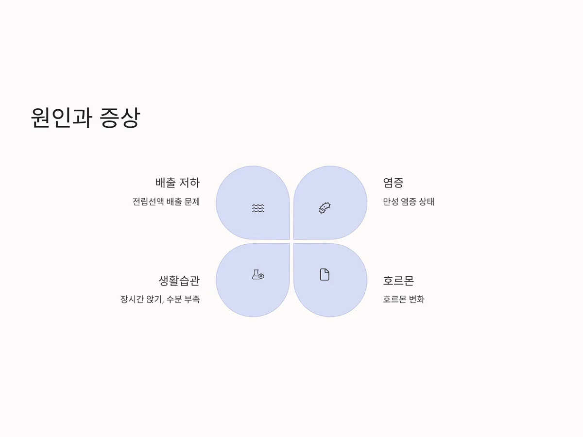 증상은 무증상부터 시작해 통증, 배뇨 장애, 혈뇨, 심지어 성생활 문제로까지 이어질 수 있습니다. 잦은 배뇨나 야간뇨가 증가하고, 배뇨 시 통증이나 잔뇨감이 느껴질 수 있으며, 때로는 정액에 피가 섞이는 경우도 있습니다. 이러한 증상이 지속될 경우 반드시 전문의의 진단을 받아야 합니다.