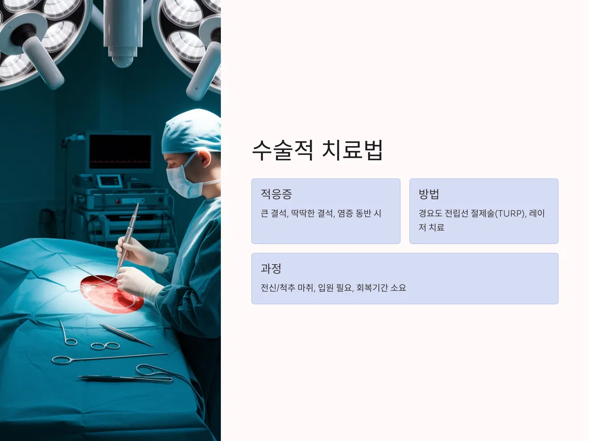 수술적 제거는 체외 충격파 치료로 해결이 어려운 경우에 선택됩니다. 결석이 크거나 딱딱해 잘게 부서지지 않는 경우, 또는 전립선염과 동반되어 결석이 염증의 원인이 되는 경우에는 내시경적 수술이나 레이저 치료가 필요합니다. 특히 내시경을 통해 결석을 직접 확인하고 제거할 수 있는 '경요도 전립선 절제술(TURP)'이 대표적입니다.