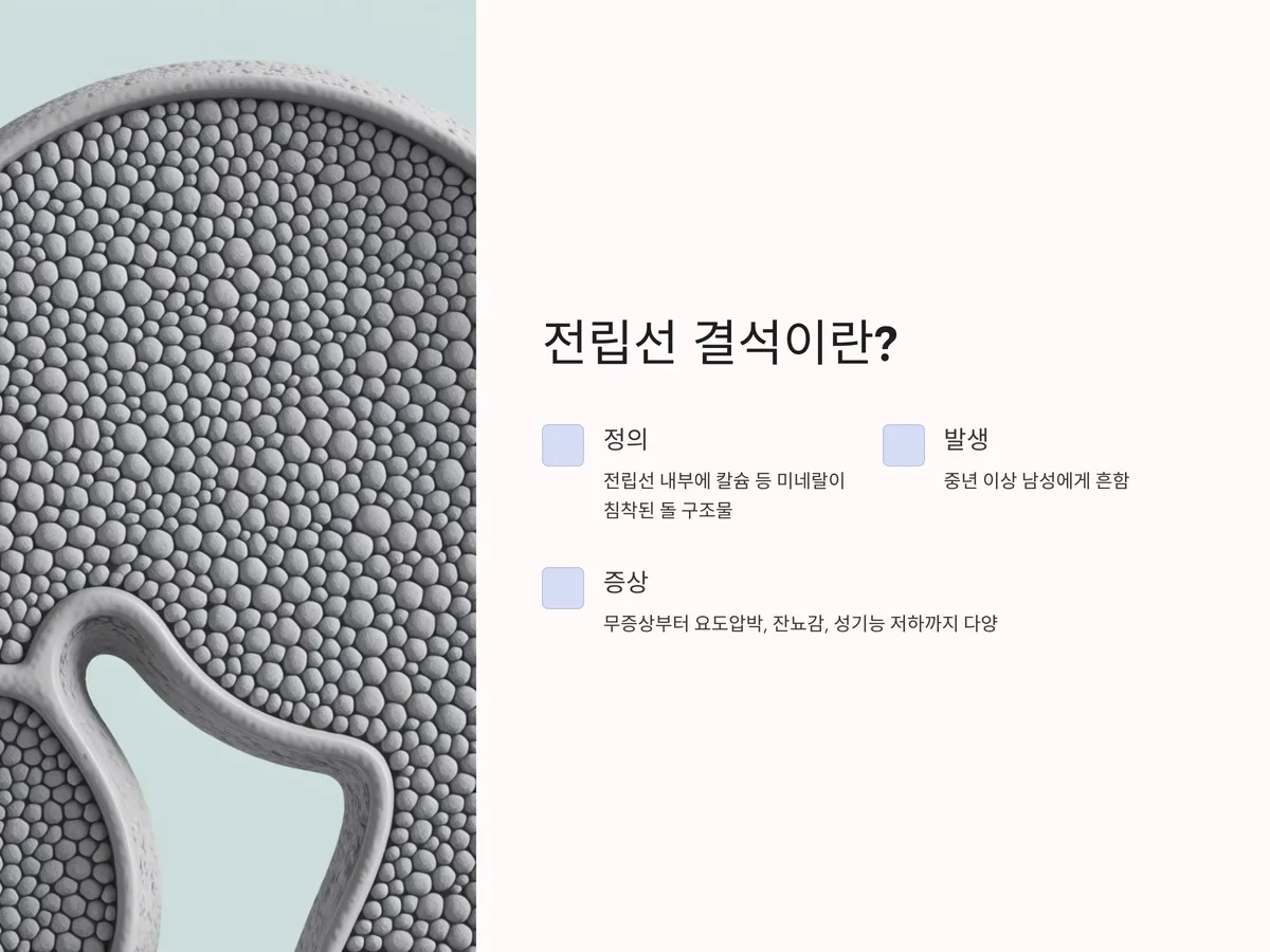전립선 결석은 전립선 내부 또는 주변의 선관에 칼슘 등의 미네랄이 침착되어 생성되는 돌 형태의 구조물입니다. 보통 크기는 작고 무증상이지만, 크기나 수가 많아질 경우 요도 압박, 잔뇨감, 성기능 저하 등 다양한 증상을 유발할 수 있습니다. 특히 중년 이상의 남성에게 많이 나타나며, 전립선 비대증이나 만성 전립선염과 함께 발생하기도 합니다.