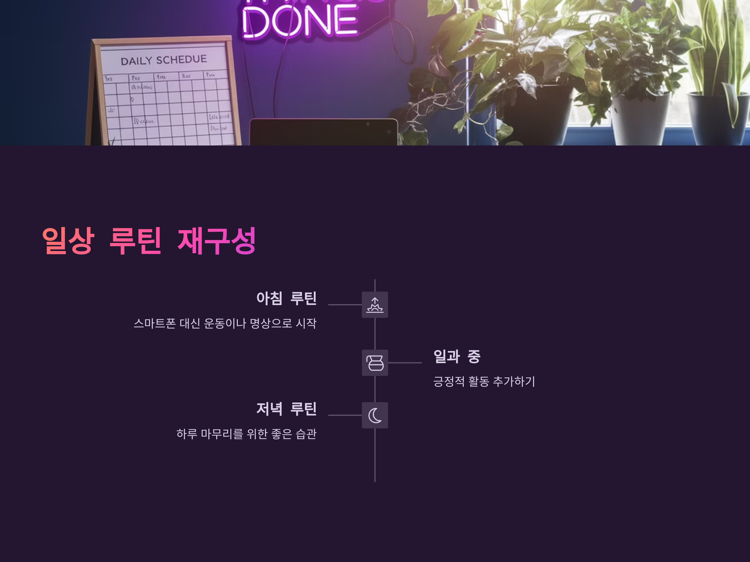 예를 들어, 아침에 일어나자마자 스마트폰을 확인하는 대신, 아침 운동을 먼저 하거나, 명상 시간을 갖는 등의 새로운 루틴을 추가할 수 있습니다. 이렇게 조금씩 일상을 바꾸면, 자연스럽게 긍정적인 습관을 만들 수 있습니다. 중요한 것은 꾸준함입니다. 하루만 해도 의미가 있지만, 매일 실천할 수 있도록 일정을 잘 관리해야 합니다.