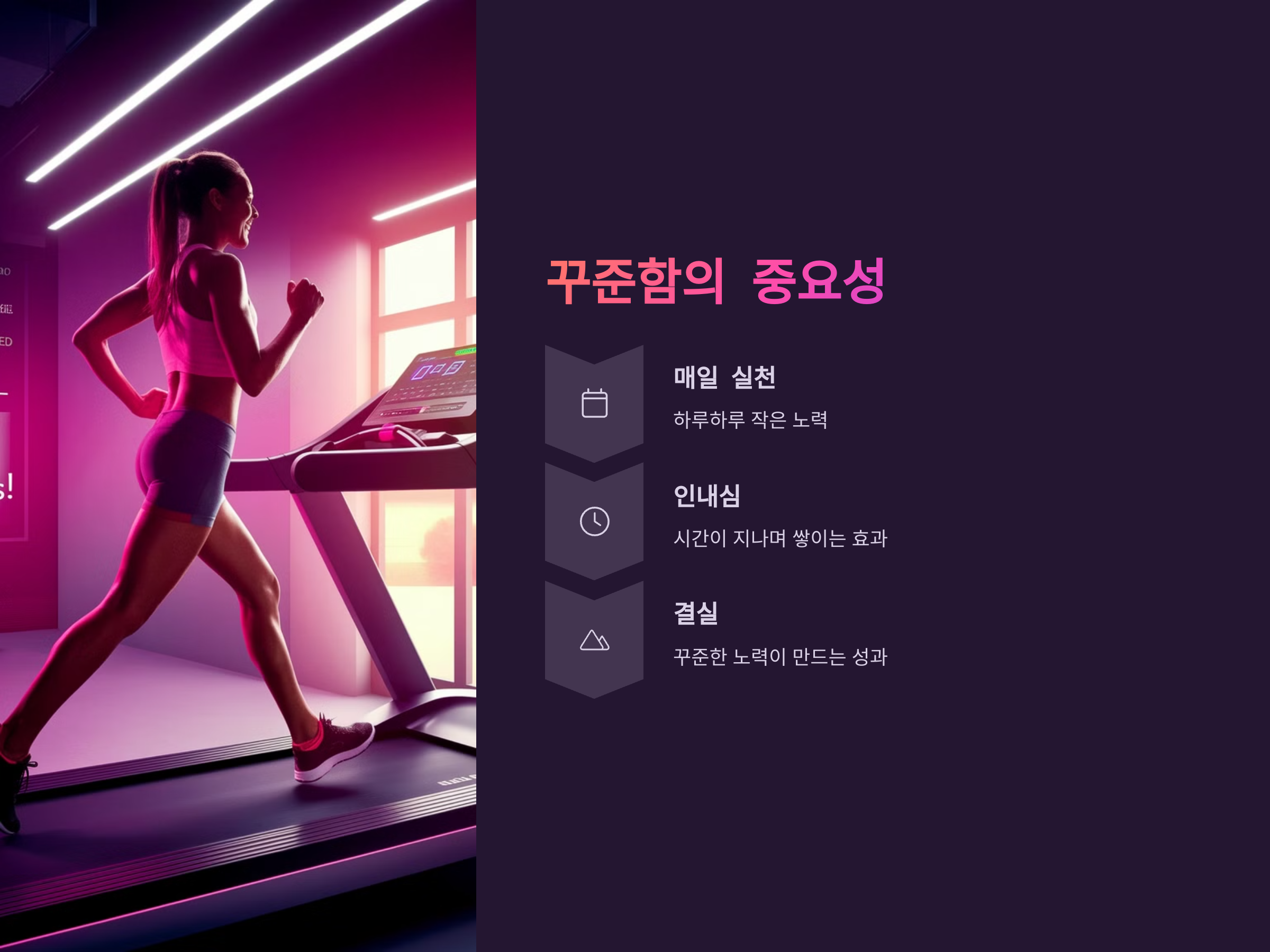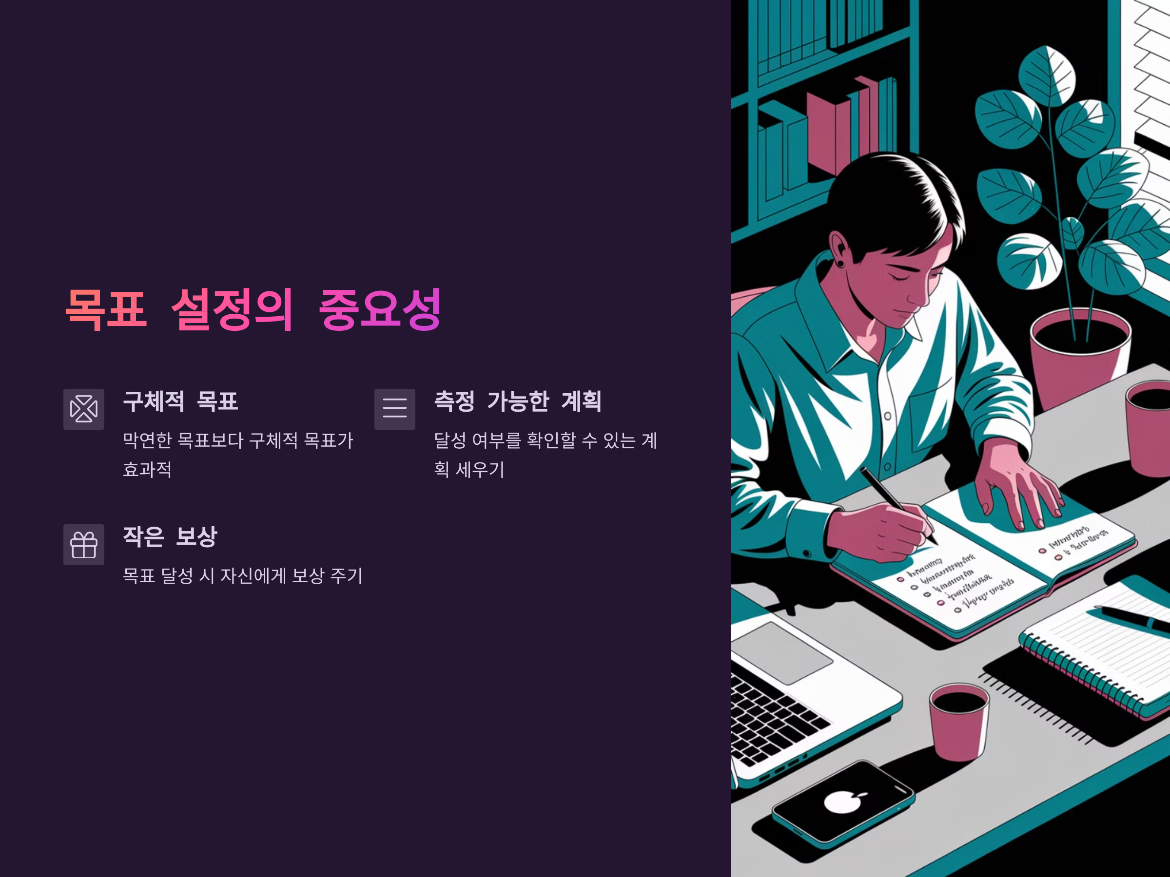 예를 들어, 하루 30분 운동을 목표로 하고 처음에는 10분씩 운동하는 것부터 시작해도 좋습니다. 이렇게 점진적으로 습관을 늘려가면, 더 오랫동안 지속할 수 있는 힘이 생깁니다. 작은 성공을 쌓아가며 점점 더 큰 목표를 달성할 수 있습니다.