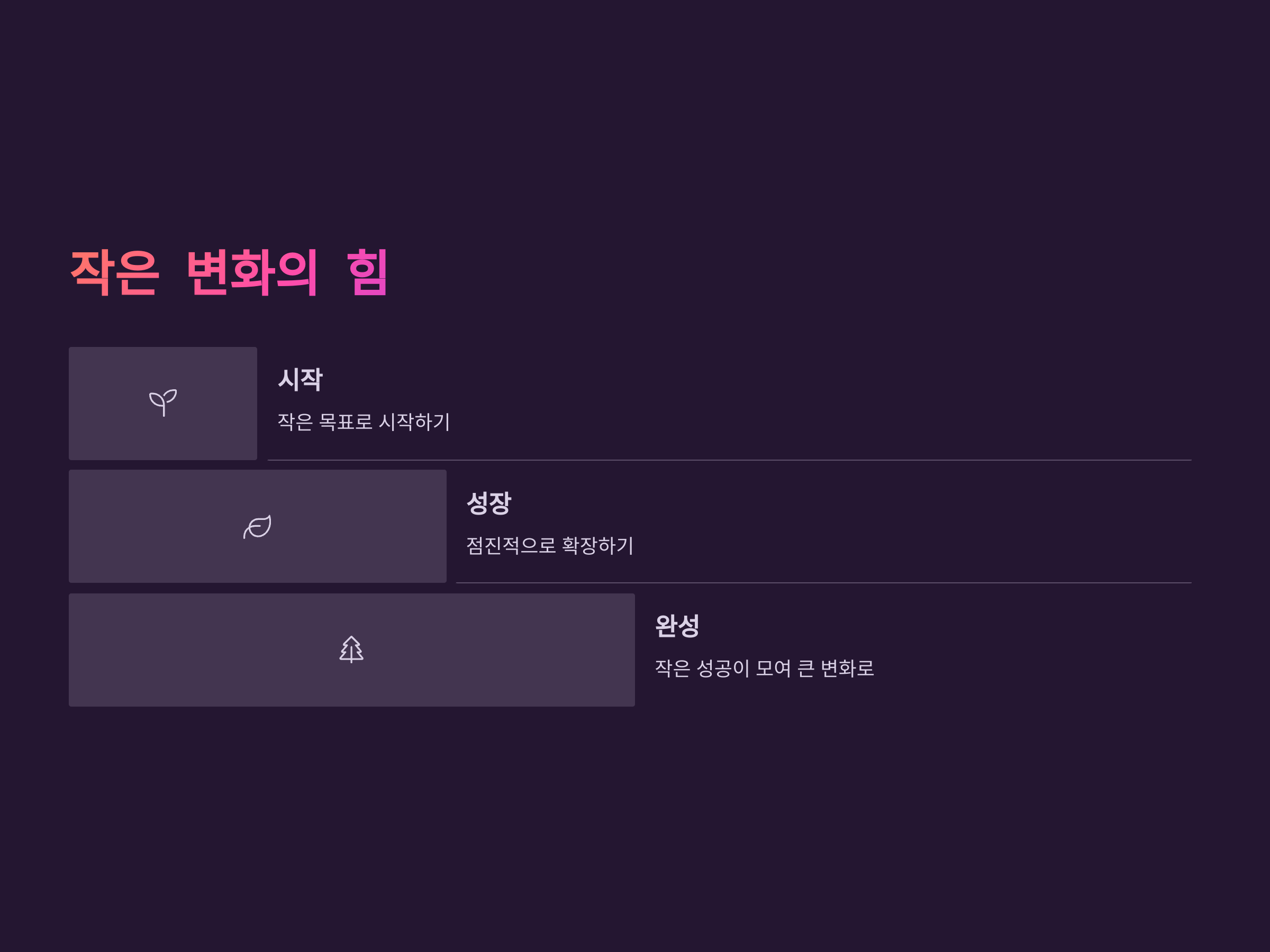어떤 습관을 시작할 때 한 번에 큰 변화를 시도하기보다는 작은 변화부터 시작하는 것이 더 효과적입니다. 작은 변화를 조금씩 시도하면, 큰 변화를 쉽게 만들어갈 수 있습니다. 한 번에 많은 것을 하려 하지 말고, 한 가지씩 차근차근 실천해보세요.