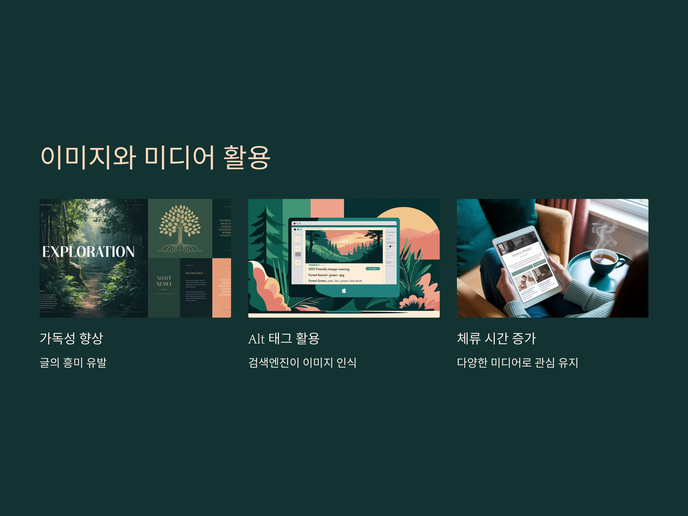 이미지는 또한 SEO 최적화에 큰 영향을 미칩니다. 이미지의 alt 태그를 활용해 이미지를 설명하는 텍스트를 추가하면, 검색엔진이 이미지를 이해하는 데 도움을 줍니다. 또한 이미지 파일 이름도 중요한데, 파일명에 키워드를 포함시키면 검색엔진이 해당 이미지를 더 잘 인식할 수 있습니다.