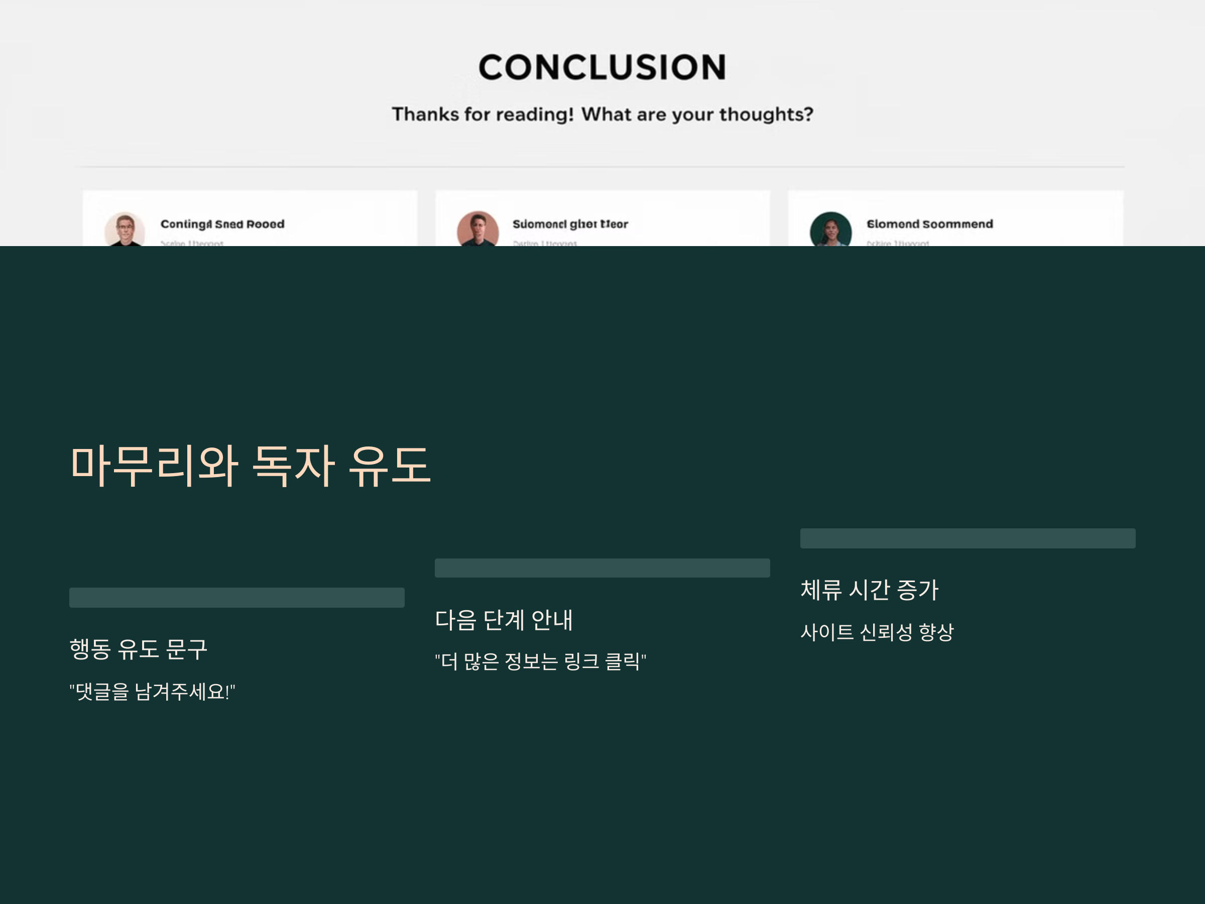이런 문구들은 독자들이 포스트를 다 읽은 후, 다음 단계를 밟을 수 있도록 도와줍니다. 댓글을 남기거나, 다른 글을 읽으러 가는 등의 행동을 유도하면 블로그의 체류 시간을 늘리고, 사이트의 전반적인 신뢰성을 높이는 데 도움이 됩니다.