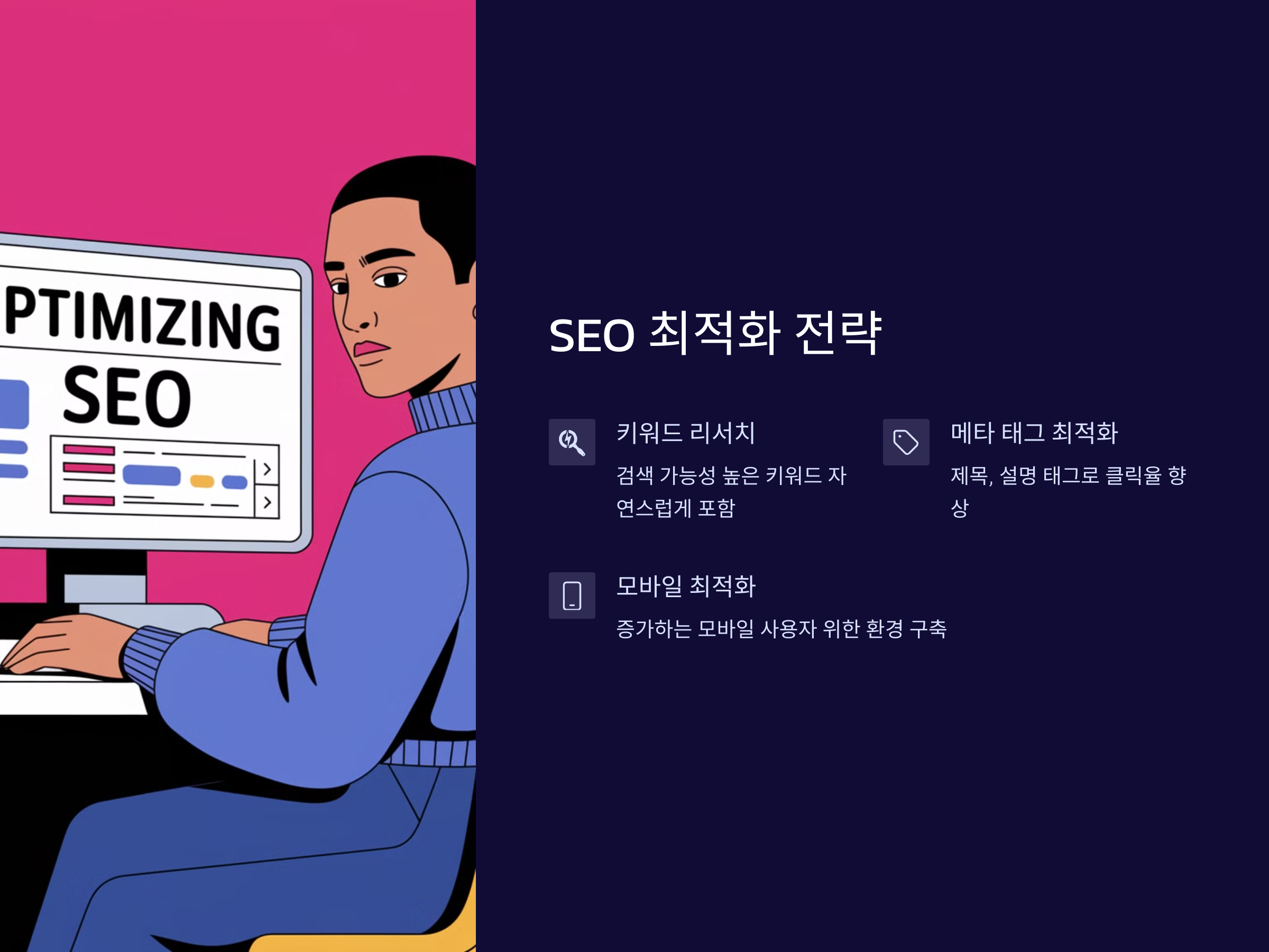 - 키워드 리서치: 방문자가 검색할 가능성이 높은 키워드를 찾아 콘텐츠에 자연스럽게 포함시킵니다.