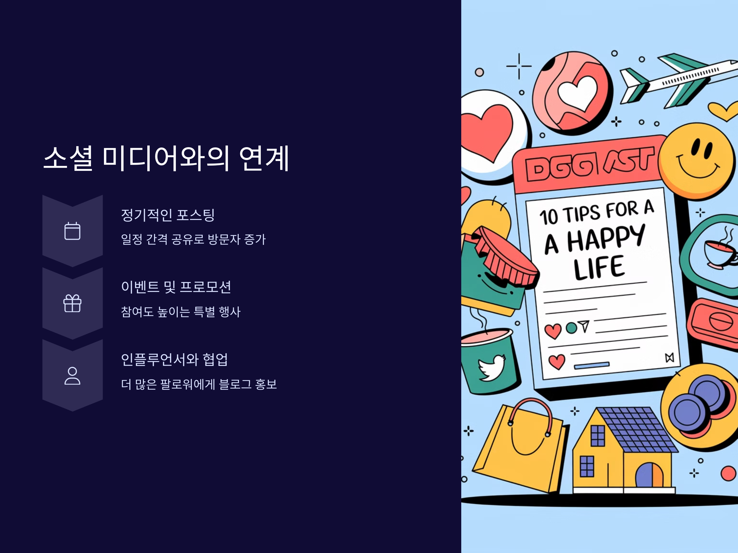- 이벤트 및 프로모션: 블로그와 연계된 이벤트나 프로모션을 진행하여 참여도를 높입니다.