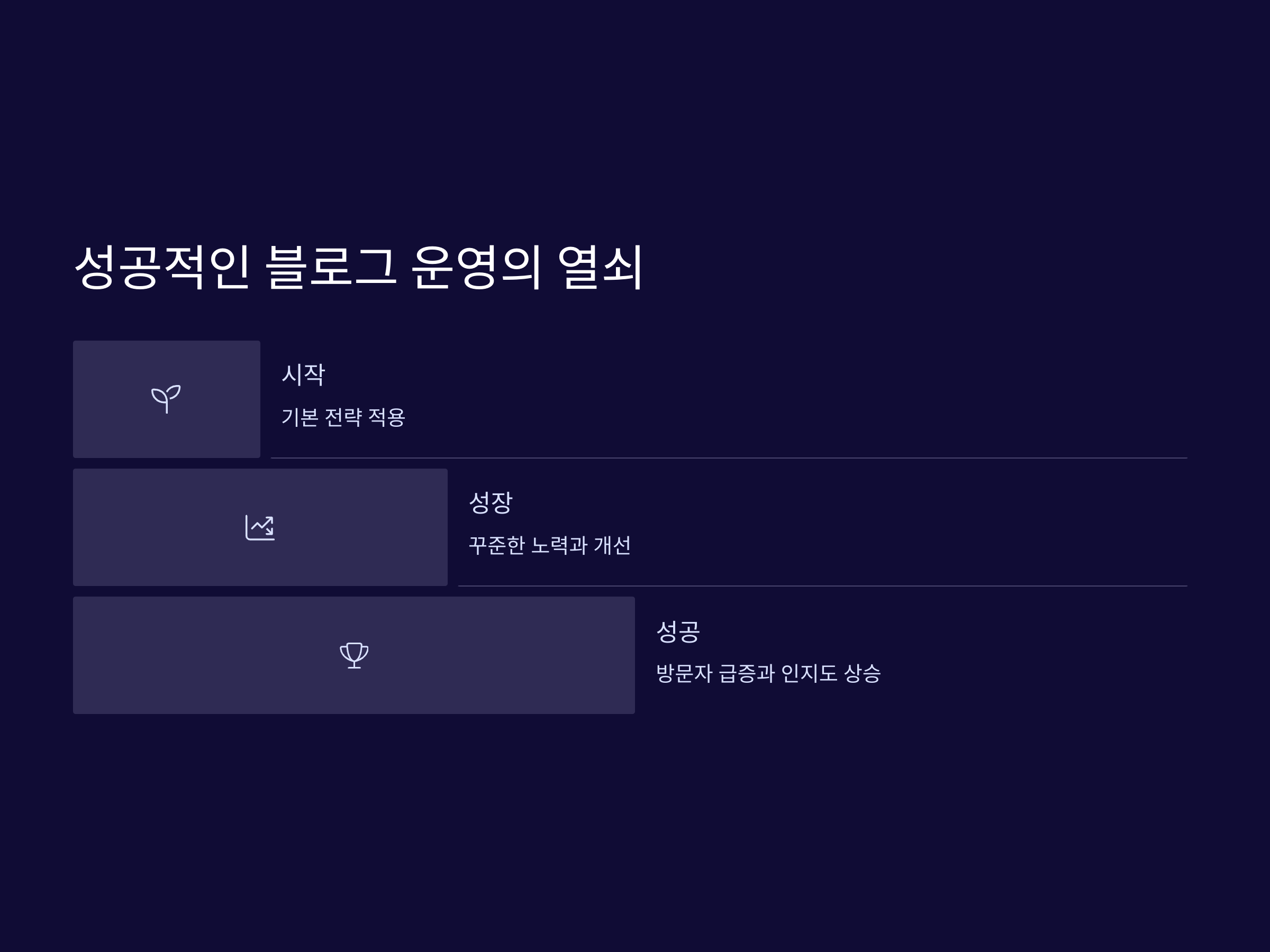 블로그의 성장을 위해서는 매일 조금씩 노력하는 것이 필요합니다. 오늘부터 위의 전략들을 적용해 보세요!