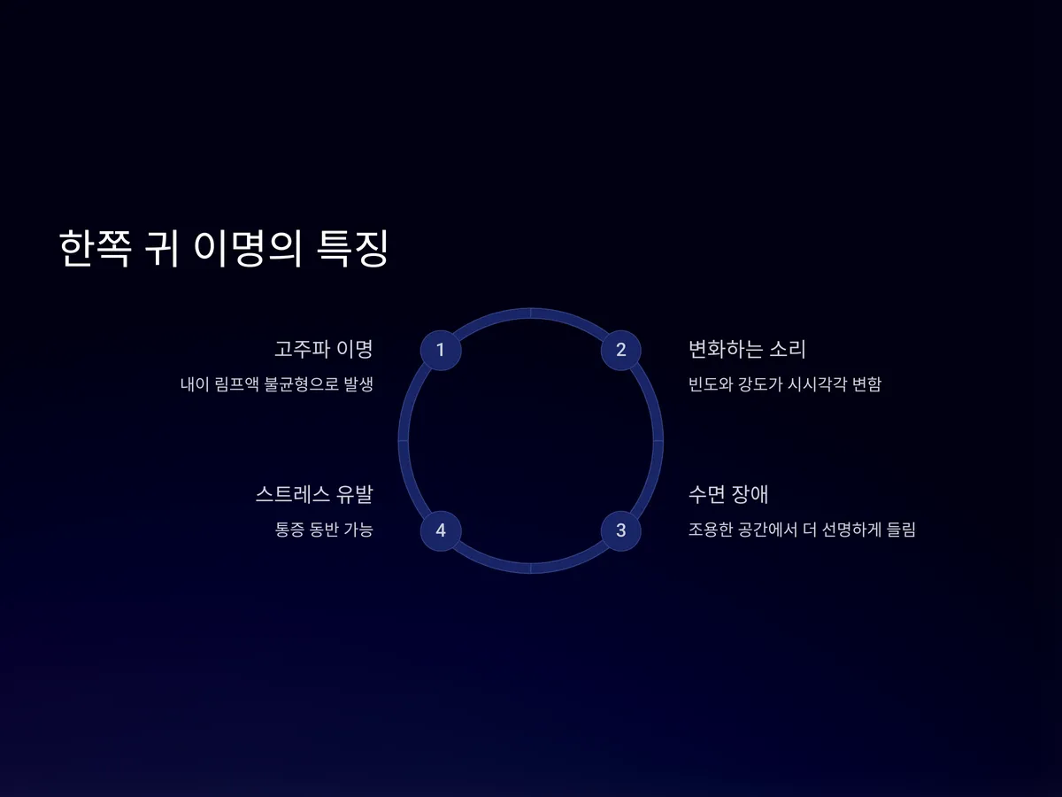 한쪽 귀에만 나타나는 이명은 일반적인 이명과 달리, 특정 질병과 연관되어 있을 가능성이 높습니다. 특히 메니에르병의 초기 증상으로 자주 등장하는 것이 바로 이 한쪽 귀의 고주파 이명입니다. 이는 내이의 림프액 불균형으로 인해 발생하며, 청각 세포에 비정상적인 자극을 주기 때문에 나타납니다.