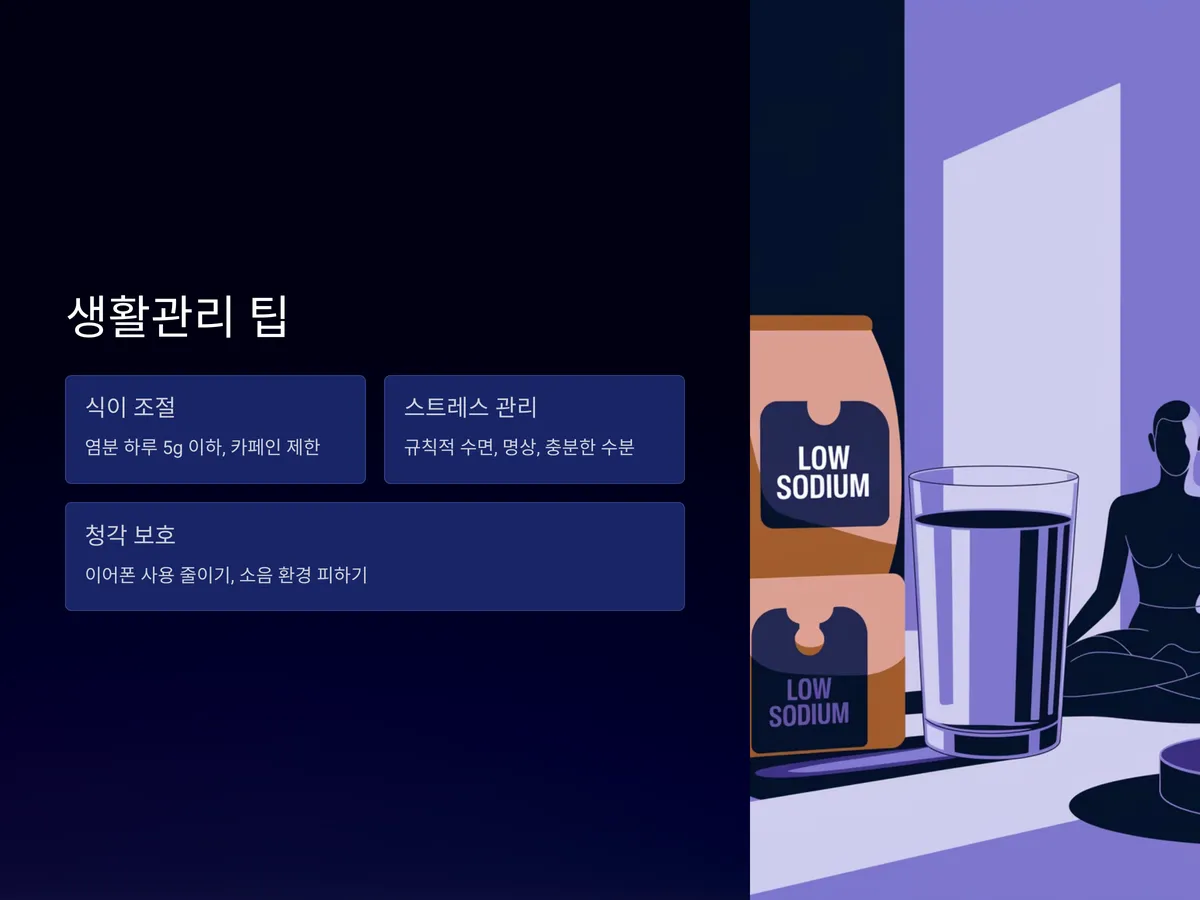 메니에르병을 완전히 치료하기는 어렵지만, 증상 완화를 위한 생활습관 관리는 매우 효과적입니다. 가장 중요한 것은 스트레스를 줄이는 것입니다. 일정한 수면 시간, 카페인과 염분 섭취 조절, 알코올 제한 등이 증상 발생 빈도를 줄여줍니다. 특히 소금 섭취는 림프액 조절과 직접 연관되므로 하루 5g 이하로 제한하는 것이 좋습니다.