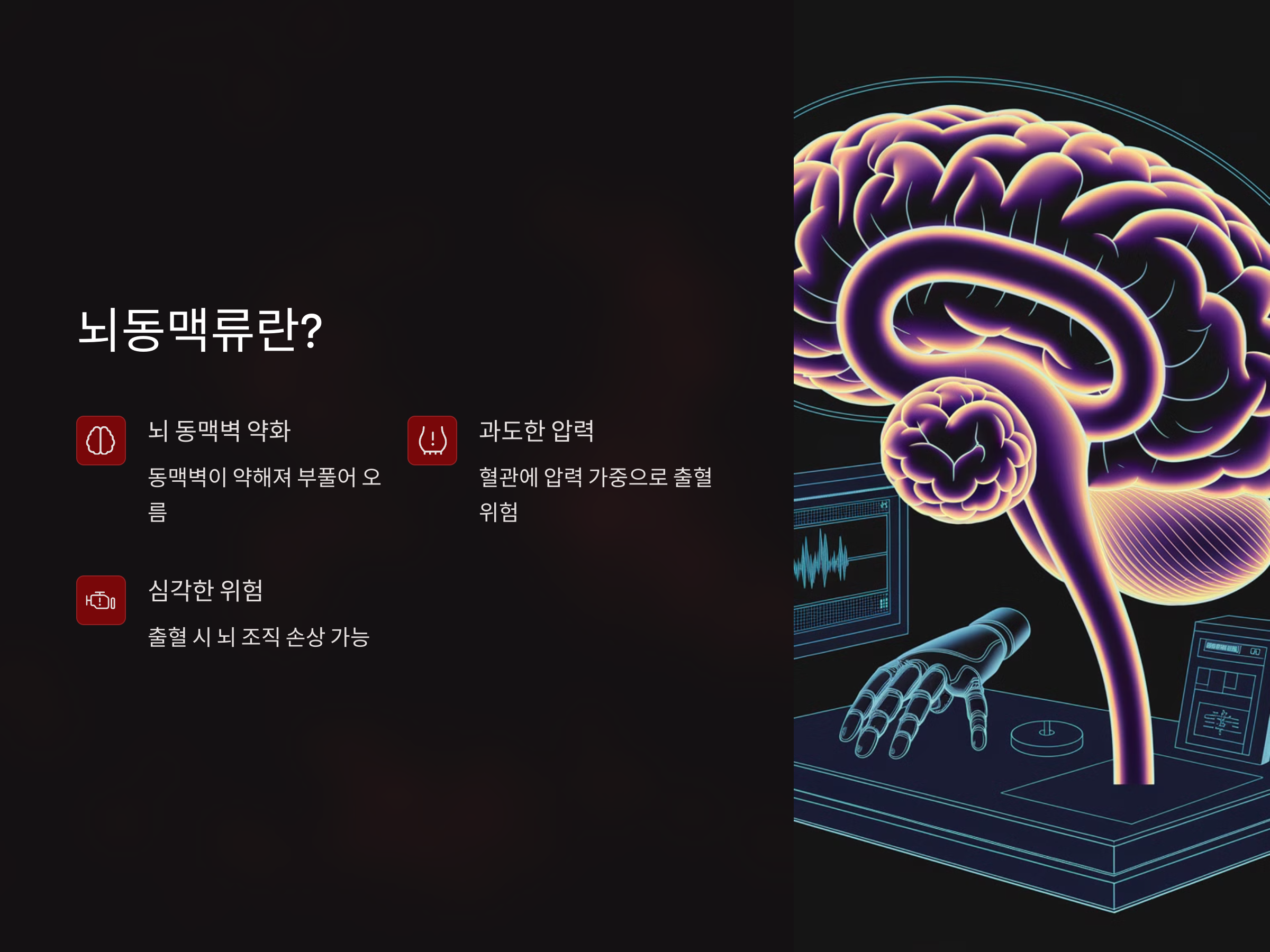 뇌동맥류는 뇌의 동맥벽이 약해져서 부풀어 오르는 상태를 말합니다. 동맥이 약해져서 팽창되면 뇌혈관에 과도한 압력이 가해지게 되고, 이로 인해 결국 출혈이 발생할 수 있습니다. 뇌동맥류는 크기가 커지거나 지속적으로 압력을 받을 경우, 갑작스러운 출혈을 일으킬 위험이 커집니다. 출혈이 발생하면 뇌에 혈액이 쏟아져 나오면서 뇌 조직에 심각한 손상을 줄 수 있으며, 이는 즉각적인 의료적 조치를 요구합니다.