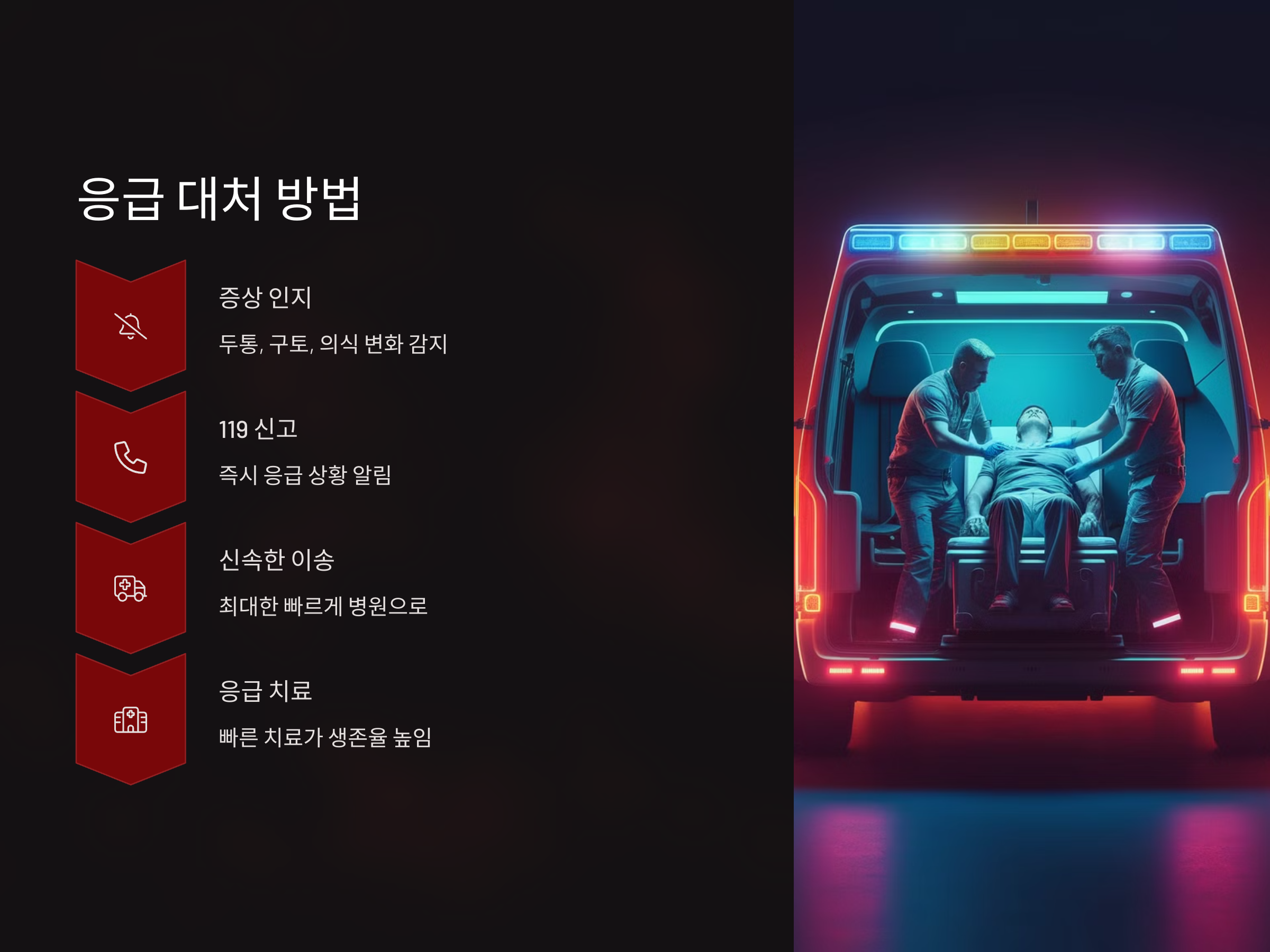 이러한 증상이 나타나면 즉각적인 응급처치가 필요하며, 지체 없이 병원으로 이동해야 합니다.