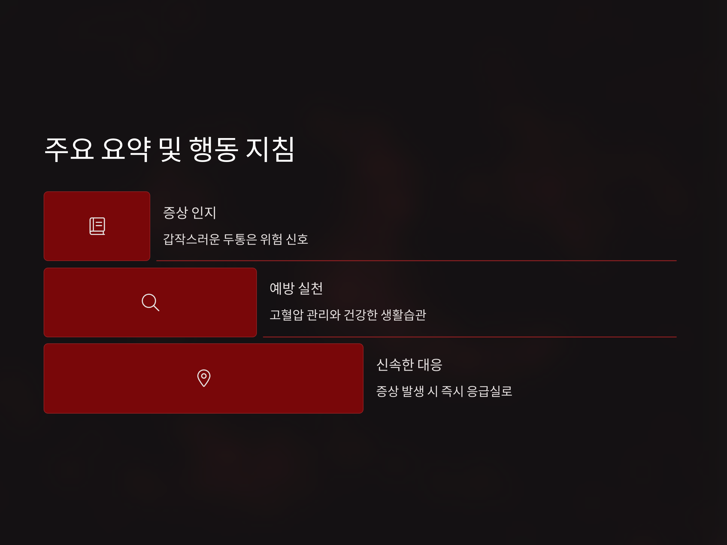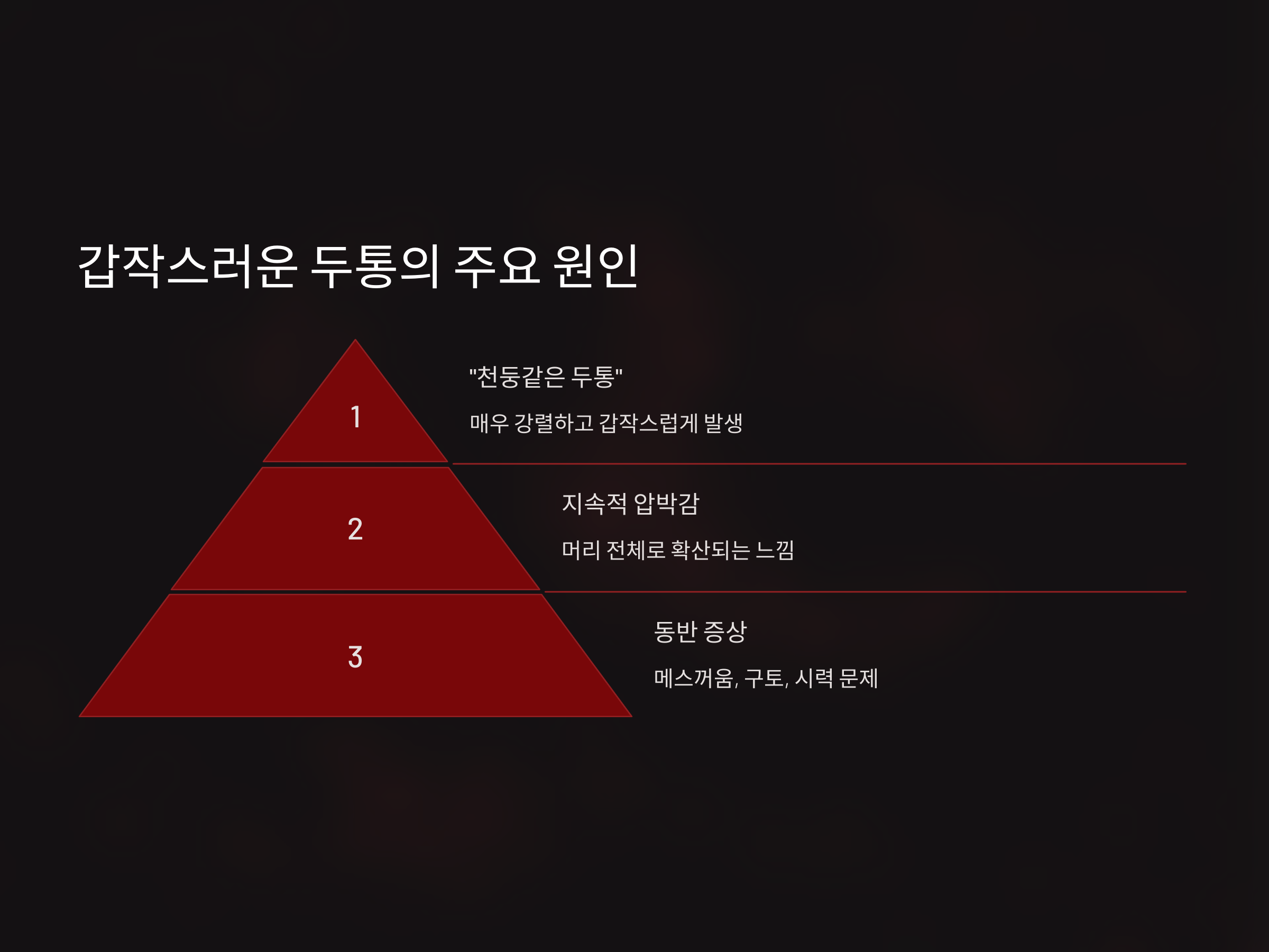- 심한 두통: 앞서 언급한 것처럼 갑작스럽고 극심한 두통이 발생합니다.