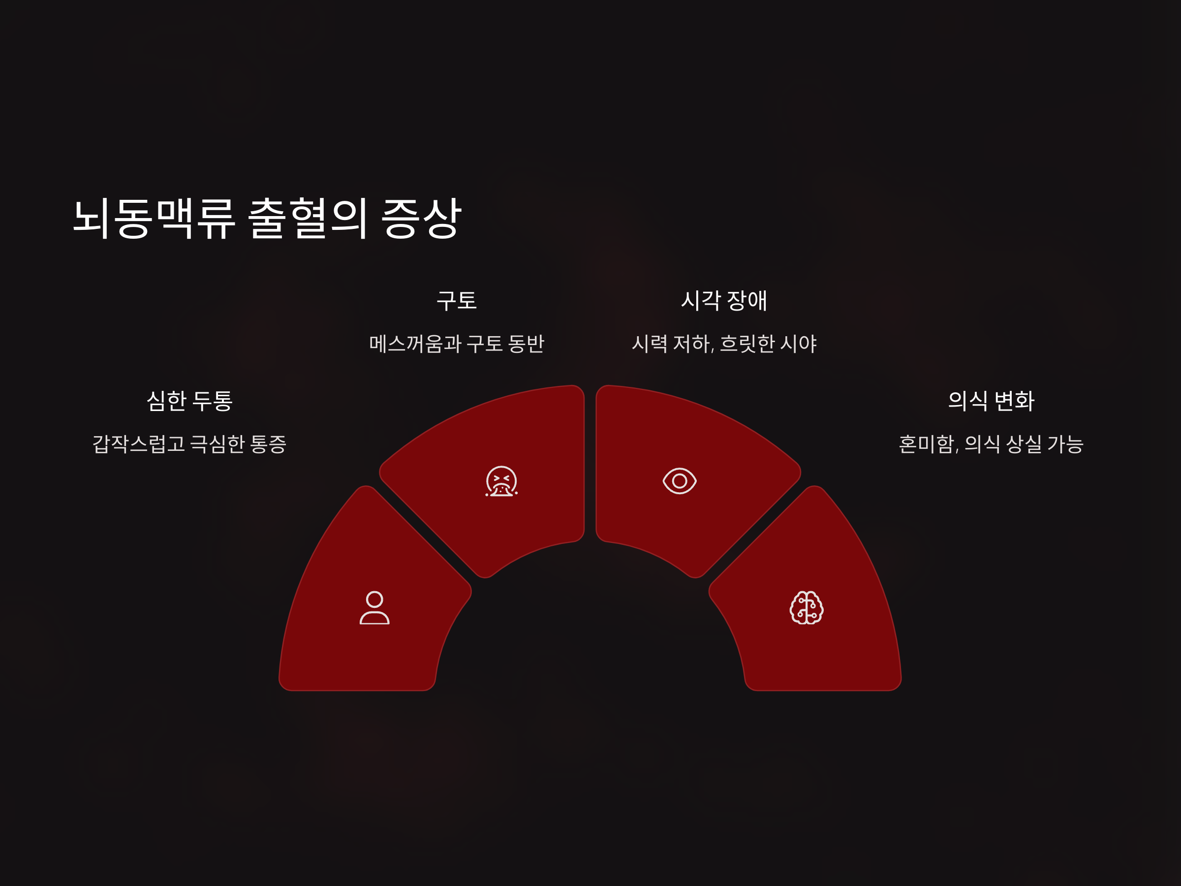 뇌동맥류가 출혈을 일으킬 때 나타나는 증상은 매우 심각합니다. 갑작스러운 두통 외에도 다음과 같은 증상이 동반될 수 있습니다:
