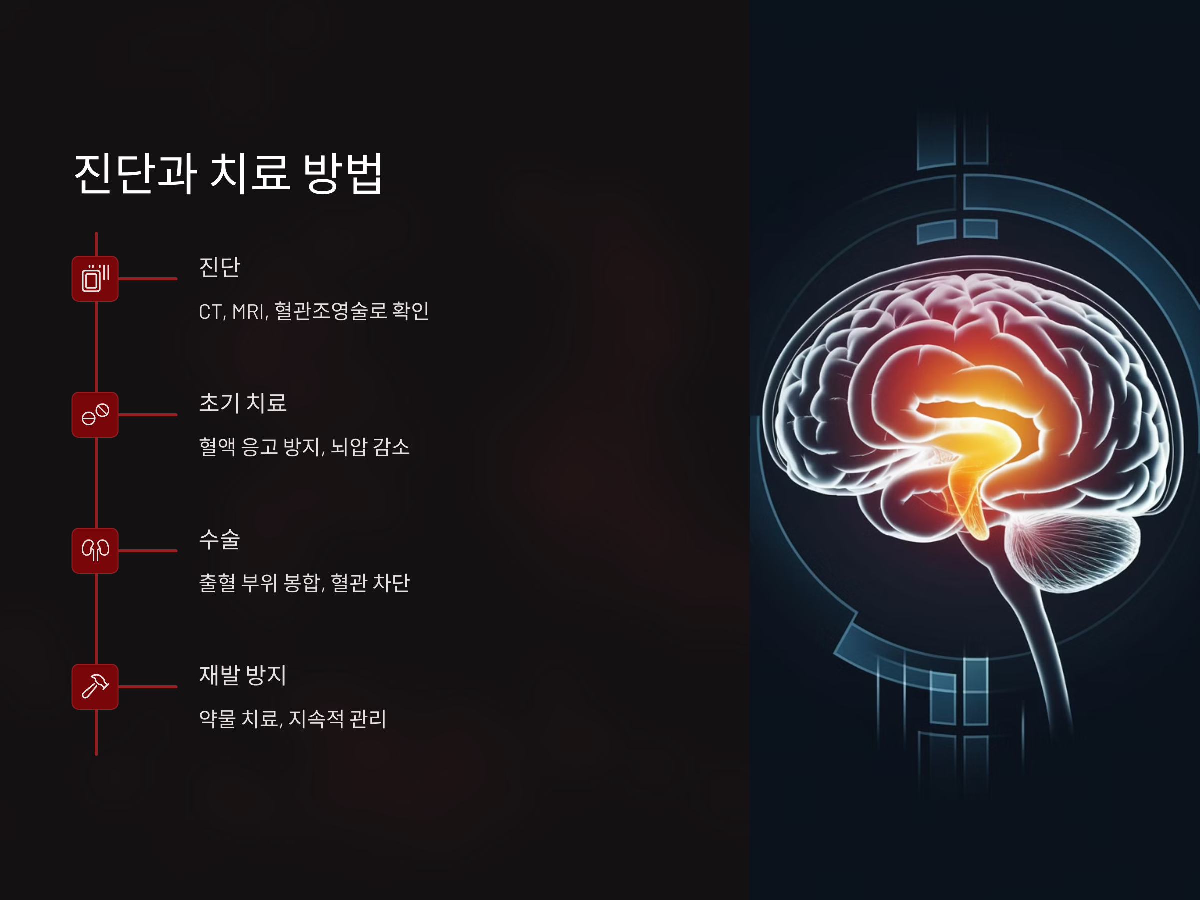 뇌동맥류 출혈이 의심되는 경우, 빠른 진단이 중요합니다. 이를 위해 의료진은 CT나 MRI를 통해 뇌의 상태를 확인하고, 출혈 여부를 파악합니다. 또한, 혈관조영술을 통해 동맥류의 크기와 위치를 파악할 수 있습니다. 진단이 확정되면, 치료 방법을 결정하게 됩니다.
