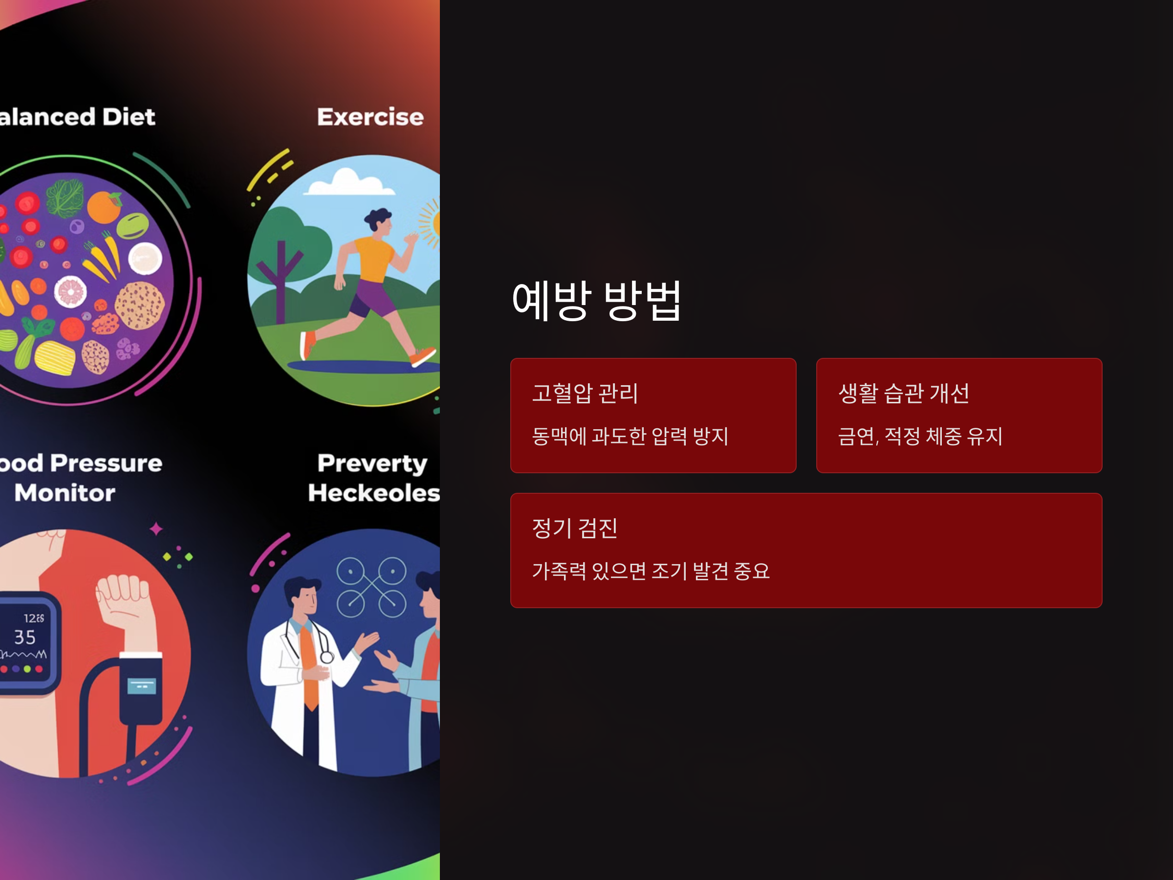 뇌동맥류 출혈을 예방하기 위해서는 뇌동맥류가 발생하지 않도록 관리하는 것이 중요합니다. 가장 중요한 것은 고혈압 관리입니다. 고혈압은 동맥에 과도한 압력을 가해 동맥류를 유발할 수 있습니다. 또한, 금연과 적정 체중 유지가 중요하며, 규칙적인 운동과 건강한 식단도 예방에 도움이 됩니다.
