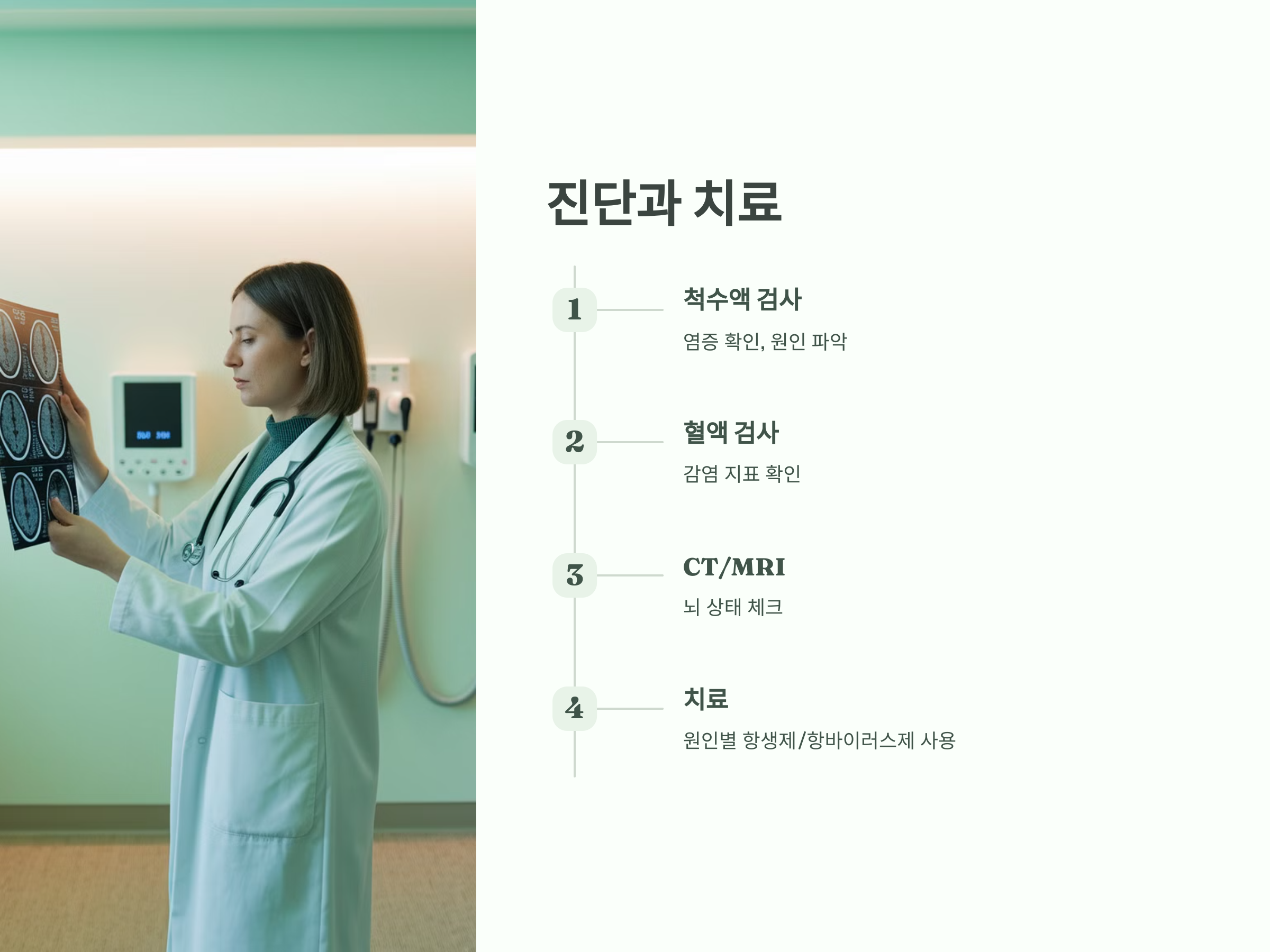 뇌수막염의 진단을 위해서는 보통 척수액 검사가 필요합니다. 척수액을 채취하여 그 안에 염증이 있는지, 어떤 세균이나 바이러스가 원인인지를 확인합니다. 또한 혈액 검사, CT나 MRI 촬영 등을 통해 뇌의 상태를 체크할 수 있습니다. 이러한 검사들이 결합되어 최종 진단을 내리게 됩니다.