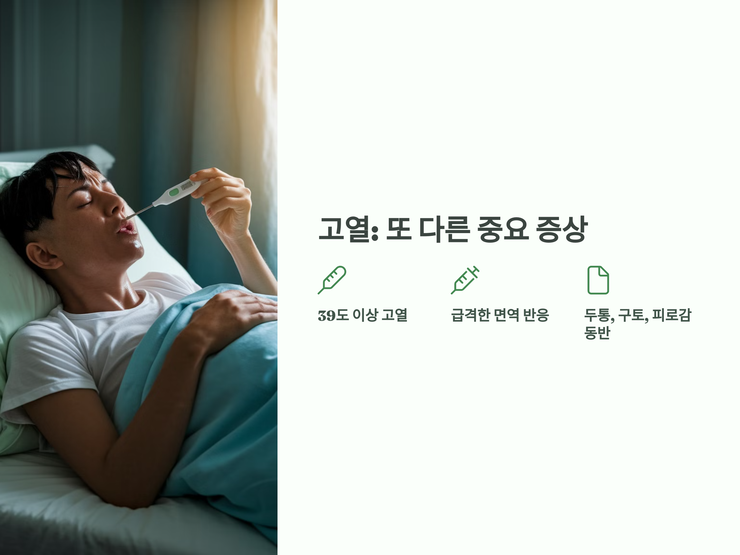 고열은 뇌수막염의 또 다른 중요한 증상으로, 체온이 급격하게 상승하면서 39도 이상의 고열이 발생할 수 있습니다. 열은 염증 반응에 의해 발생하는데, 뇌수막염이 발생하면 체내에서 급격한 면역 반응이 일어나면서 고열이 동반됩니다. 고열과 함께 두통, 구토, 피로감 등이 동반될 수 있습니다.