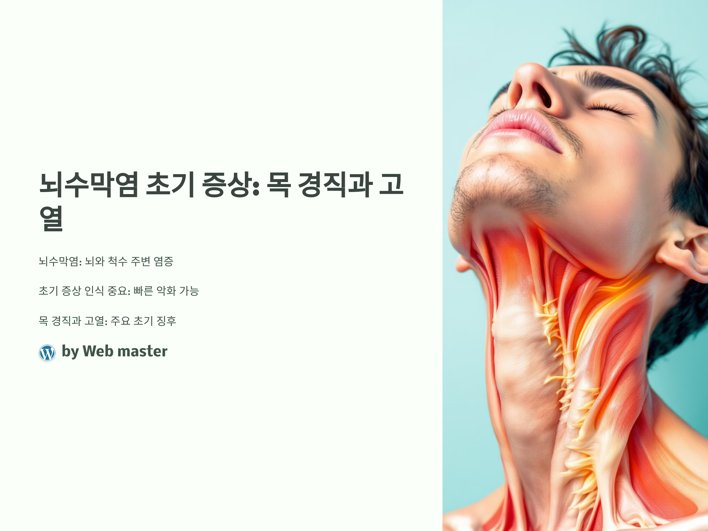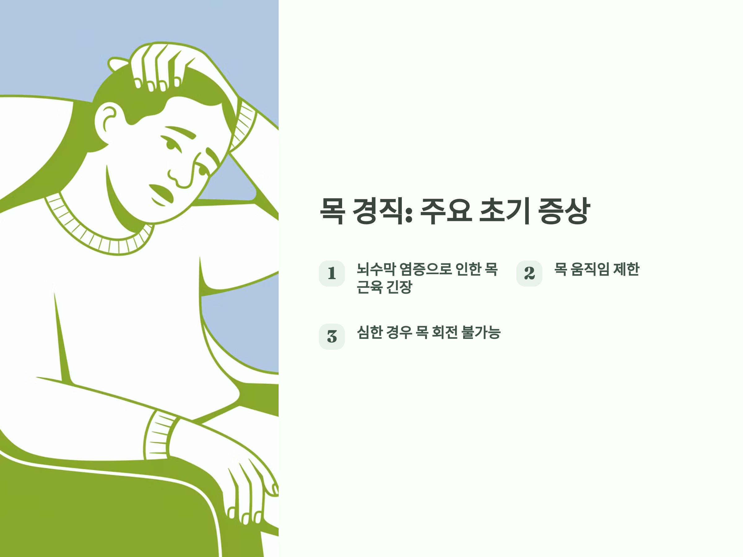 목 경직은 뇌수막염을 의심할 수 있는 첫 번째 징후 중 하나입니다. 뇌수막염에 걸리면 뇌수막의 염증이 발생하여 목 근육에 긴장이 생기고, 이로 인해 목이 뻣뻣하게 굳어지는 현상이 나타날 수 있습니다. 이때 목을 움직이기 어렵고, 심한 경우에는 목을 한쪽으로 기울이거나 정상적으로 회전시키지 못하게 됩니다.