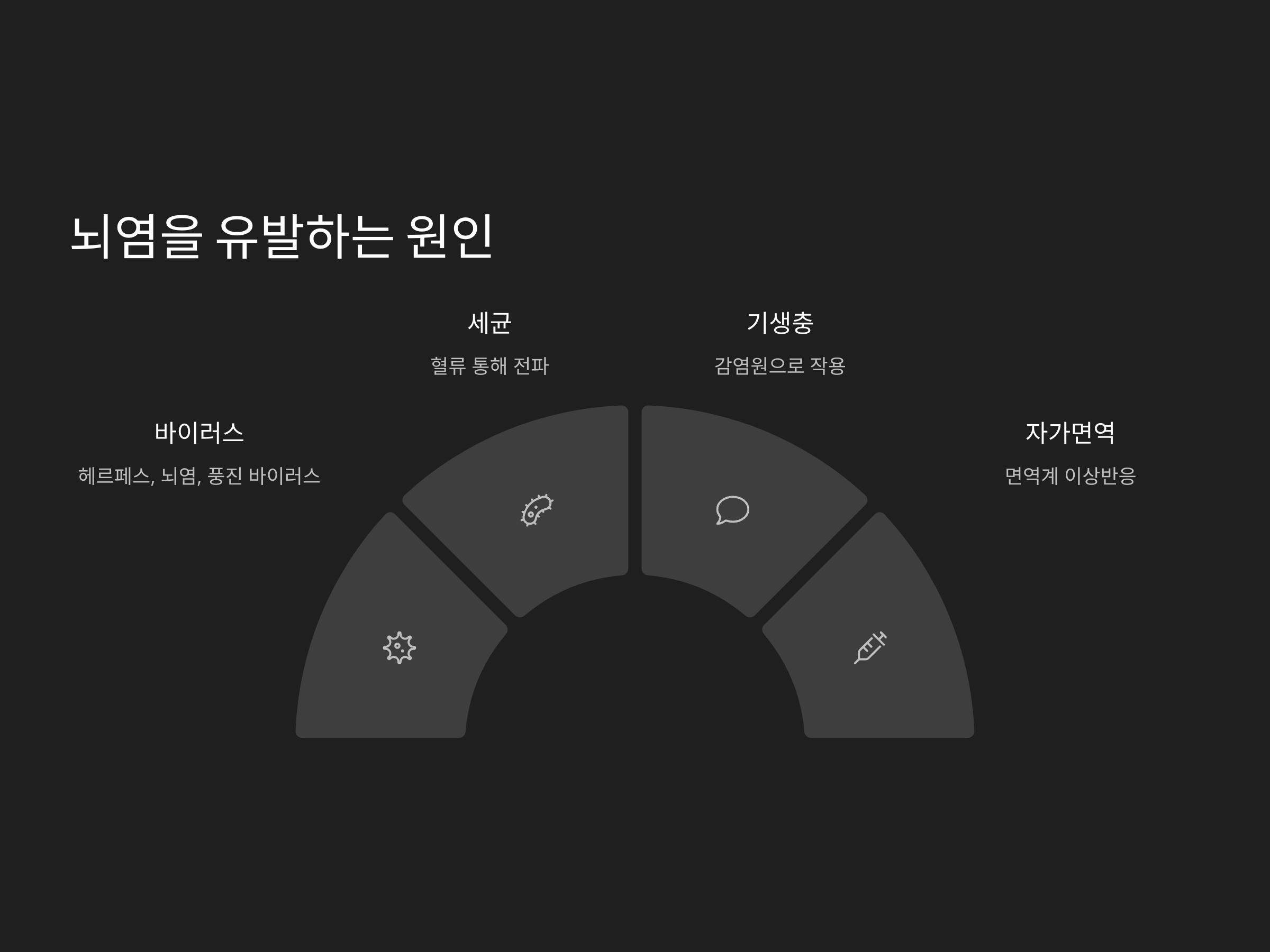 뇌염을 일으킬 수 있는 원인은 다양합니다. 그 중에서 바이러스가 주요 원인으로 작용하는 경우가 많습니다. 대표적으로 헤르페스 바이러스, 뇌염 바이러스, 풍진 바이러스 등이 있으며, 이들 바이러스는 뇌에 염증을 일으킬 수 있습니다. 또한, 세균 감염, 기생충, 또는 기타 감염원도 뇌염을 유발할 수 있습니다. 세균성 뇌염의 경우, 혈류를 통해 뇌로 전파되거나, 뇌막염으로부터 퍼져 나오는 경우가 많습니다. 감염 외에도 면역계의 이상반응으로 자가면역성 뇌염이 발생할 수 있습니다.