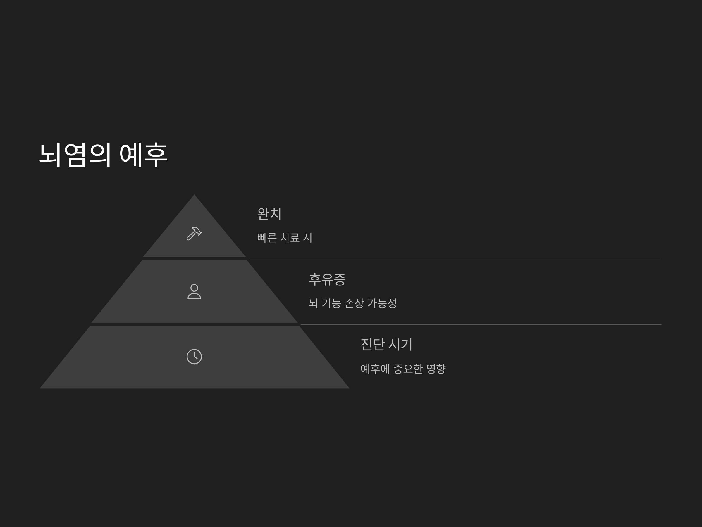 뇌염의 예후는 원인, 진단 시기, 치료에 따라 다릅니다. 치료가 적시에 이루어지지 않으면 뇌의 기능에 심각한 손상을 남길 수 있으며, 결과적으로 장기적인 후유증이 발생할 수 있습니다. 그러나 빠른 치료를 받으면 완치 가능성도 높아집니다. 뇌염을 예방하기 위해서는 예방 접종을 받는 것이 중요합니다. 예를 들어, 일본뇌염이나 풍진 등의 예방접종은 뇌염을 예방할 수 있는 방법 중 하나입니다. 또한, 감염병 예방을 위해 개인 위생을 철저히 관리하고, 모기나 진드기와 같은 감염 매개체에 대한 주의를 기울여야 합니다.