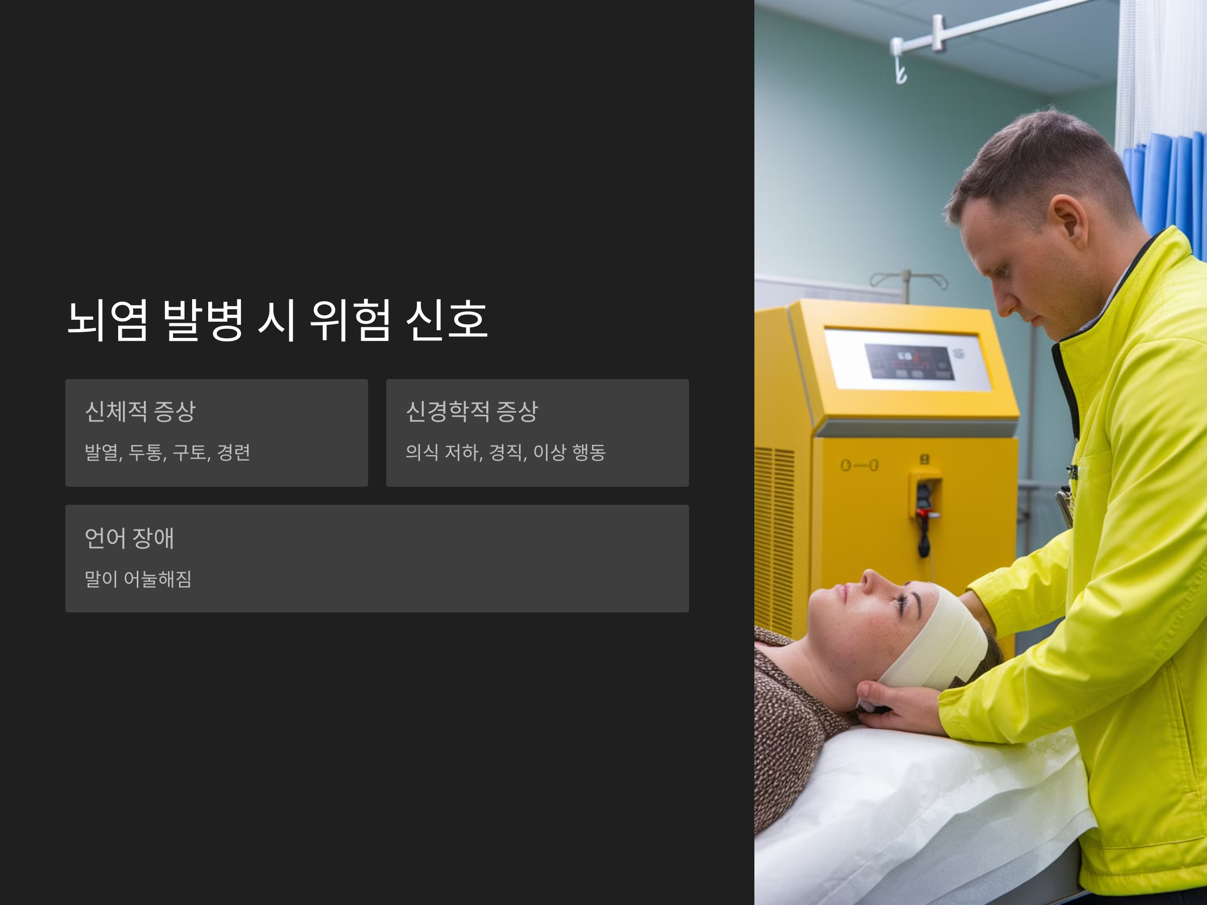 뇌염이 의심되는 경우, 신속히 병원에 가는 것이 중요합니다. 발열과 의식 저하는 위험 신호이며, 그 외에도 두통, 구토, 경련, 경직 등이 나타날 수 있습니다. 또한, 환자가 이상 행동을 보이거나 말이 어눌해지는 등의 신경학적 증상이 나타날 수 있습니다. 이러한 증상들이 나타나면 가능한 빨리 전문가의 진단을 받아야 합니다.