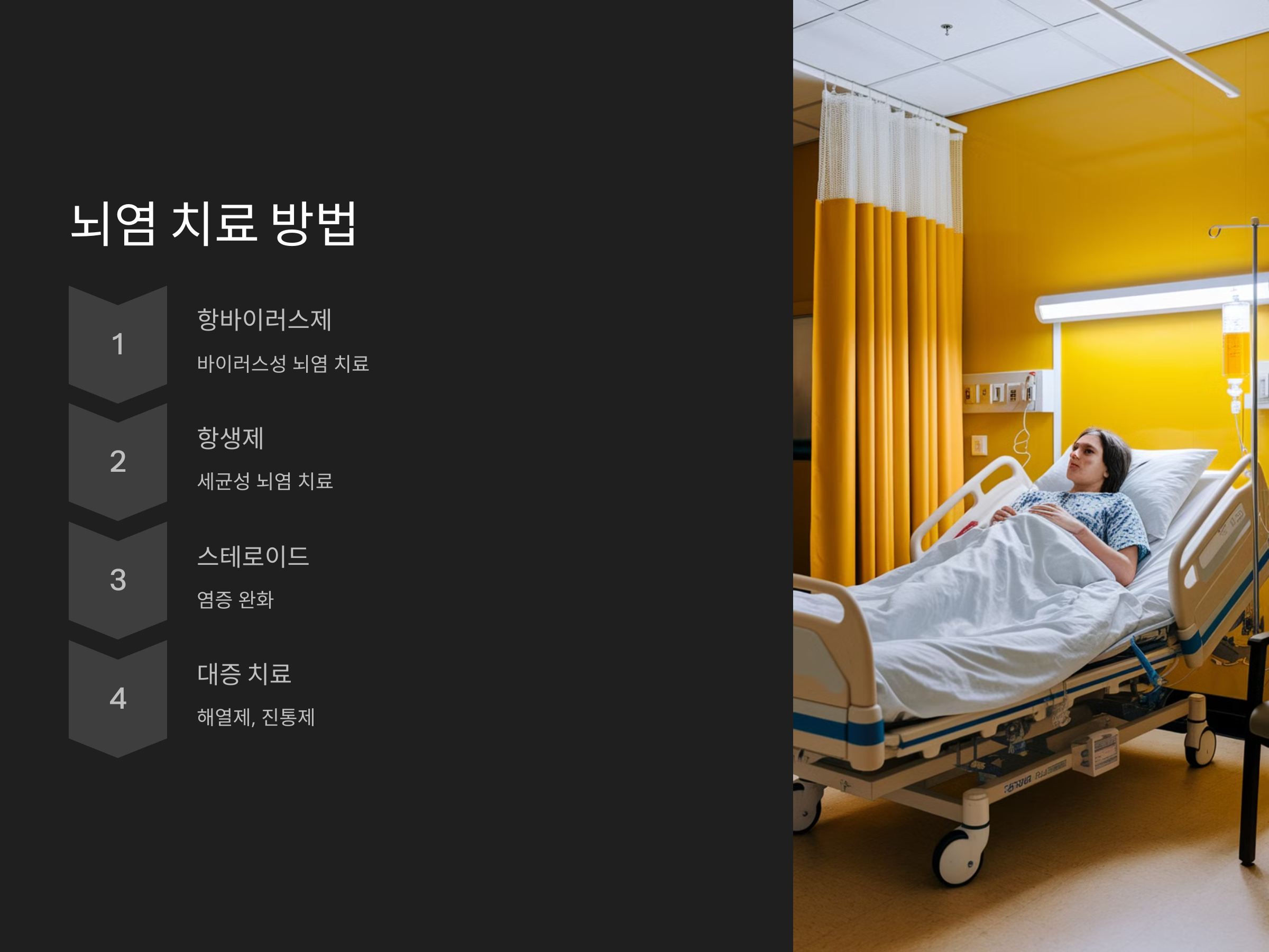 뇌염의 치료는 원인에 따라 달라집니다. 바이러스성 뇌염의 경우, 항바이러스제가 사용되며, 헤르페스 바이러스에 의한 뇌염은 항바이러스제인 아시클로비르로 치료됩니다. 세균성 뇌염인 경우에는 항생제를 투여하여 감염을 막습니다. 또한, 염증을 완화하기 위해 스테로이드가 사용되기도 하며, 증상 완화를 위해 해열제나 진통제가 처방될 수 있습니다. 치료의 핵심은 빠르게 정확한 진단을 받고, 적절한 약물로 염증을 조절하는 것입니다.