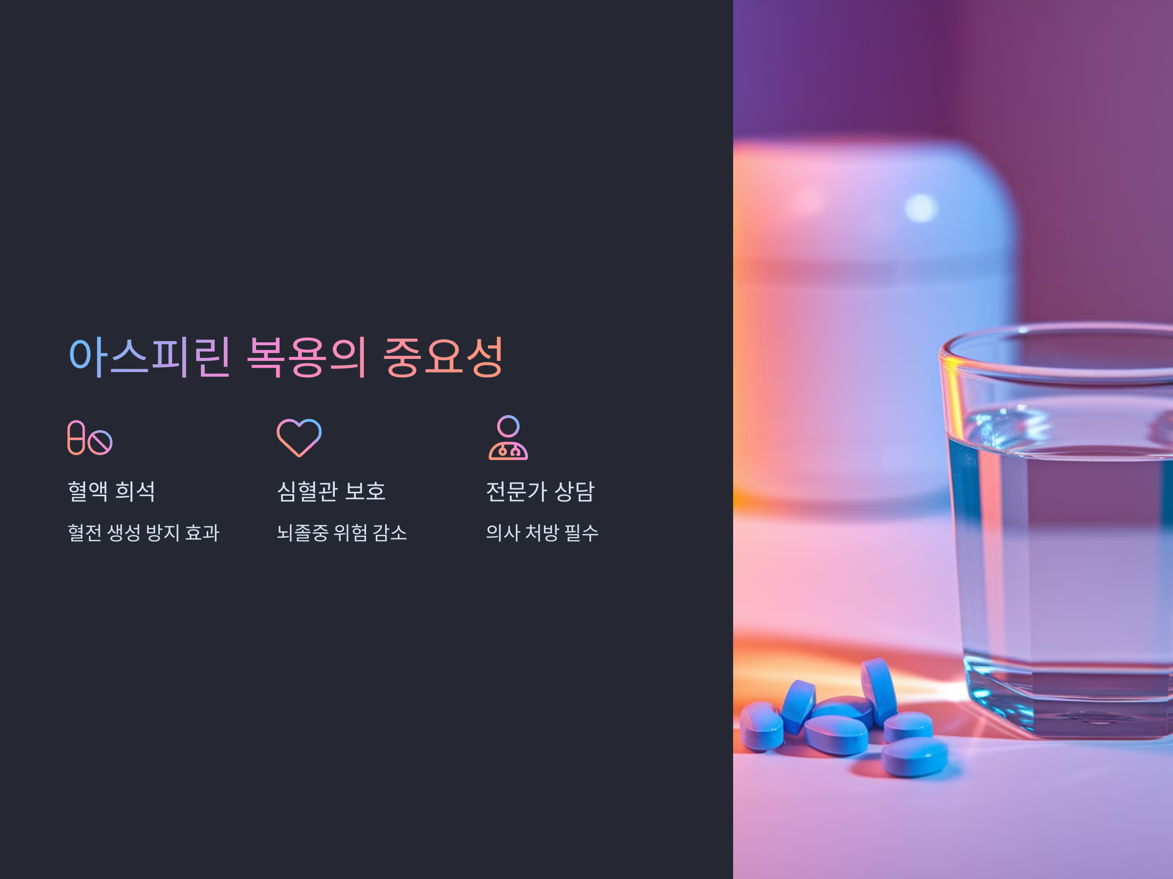 하지만 아스피린을 사용할 때는 반드시 주의해야 할 점이 있습니다. 일반적으로 아스피린은 저용량으로 복용하며, 이를 통해 혈액 응고를 예방하는 데 도움을 줍니다. 그러나 아스피린을 복용하기 전에는 의사와 상담을 해야 합니다. 아스피린은 다른 약물과 상호작용을 일으킬 수 있으며, 위장에 자극을 줄 수 있기 때문입니다. 또한, 아스피린 복용 후 출혈 등의 부작용이 발생할 수 있으므로, 전문가의 처방을 받는 것이 중요합니다.