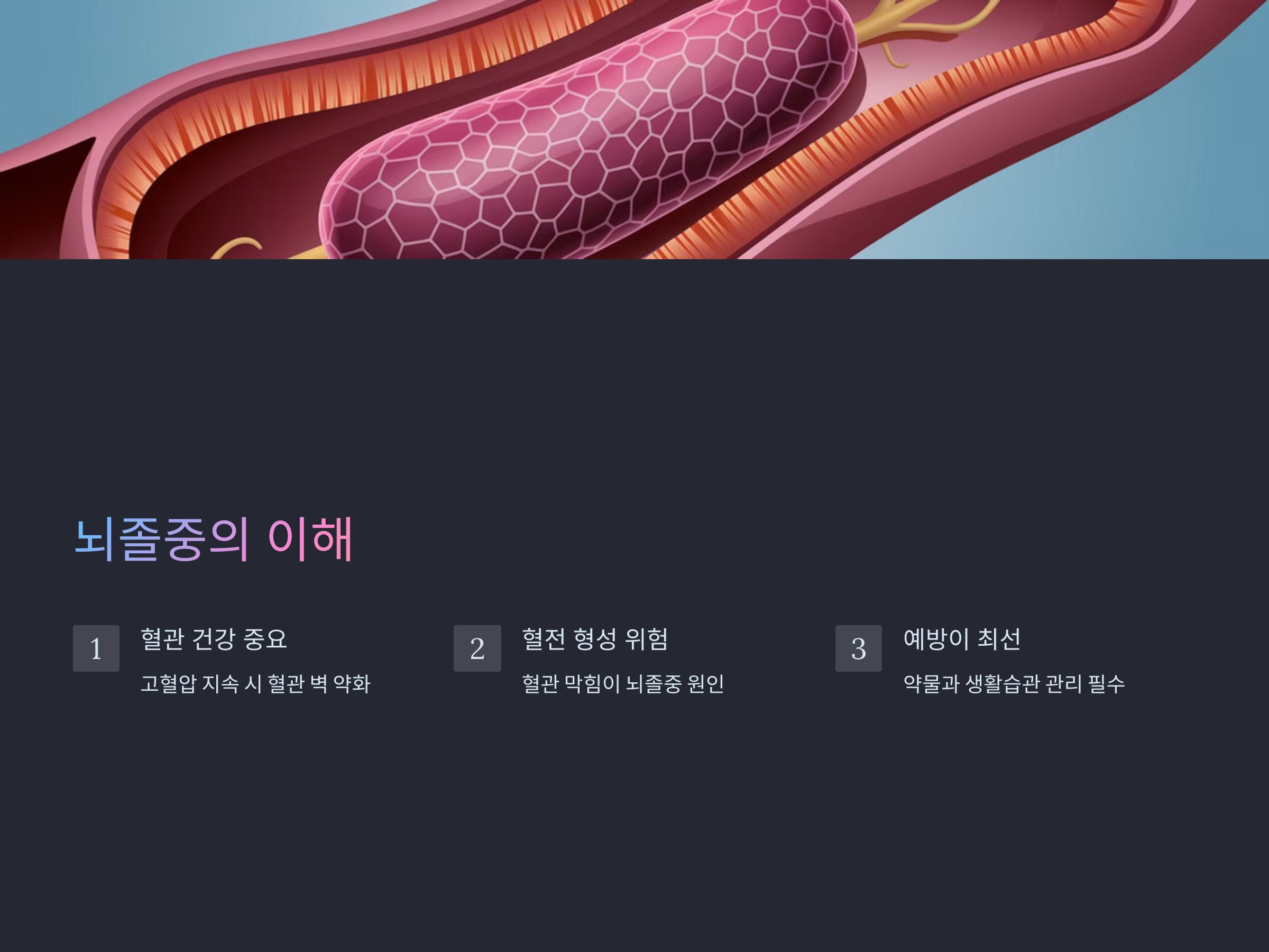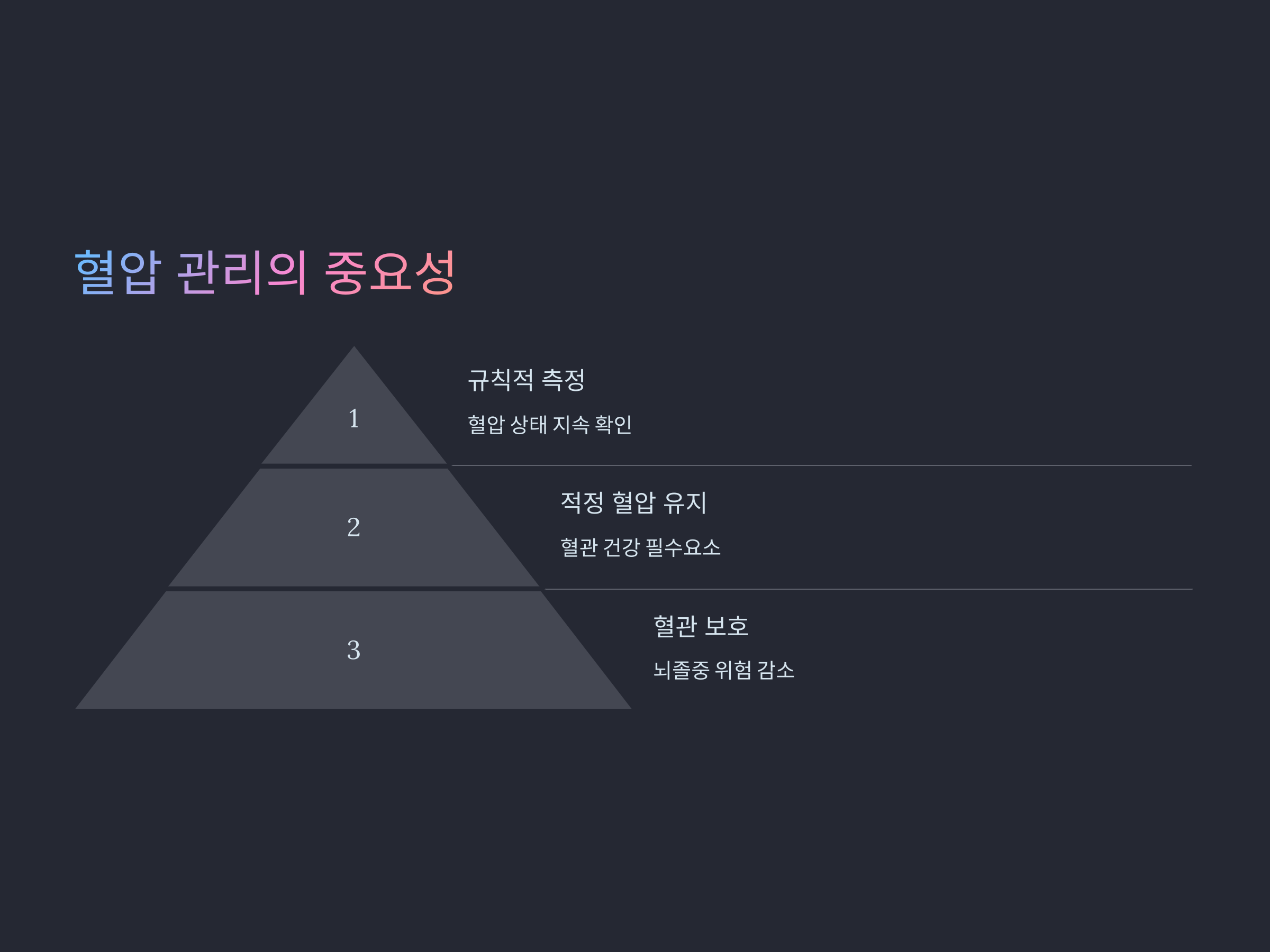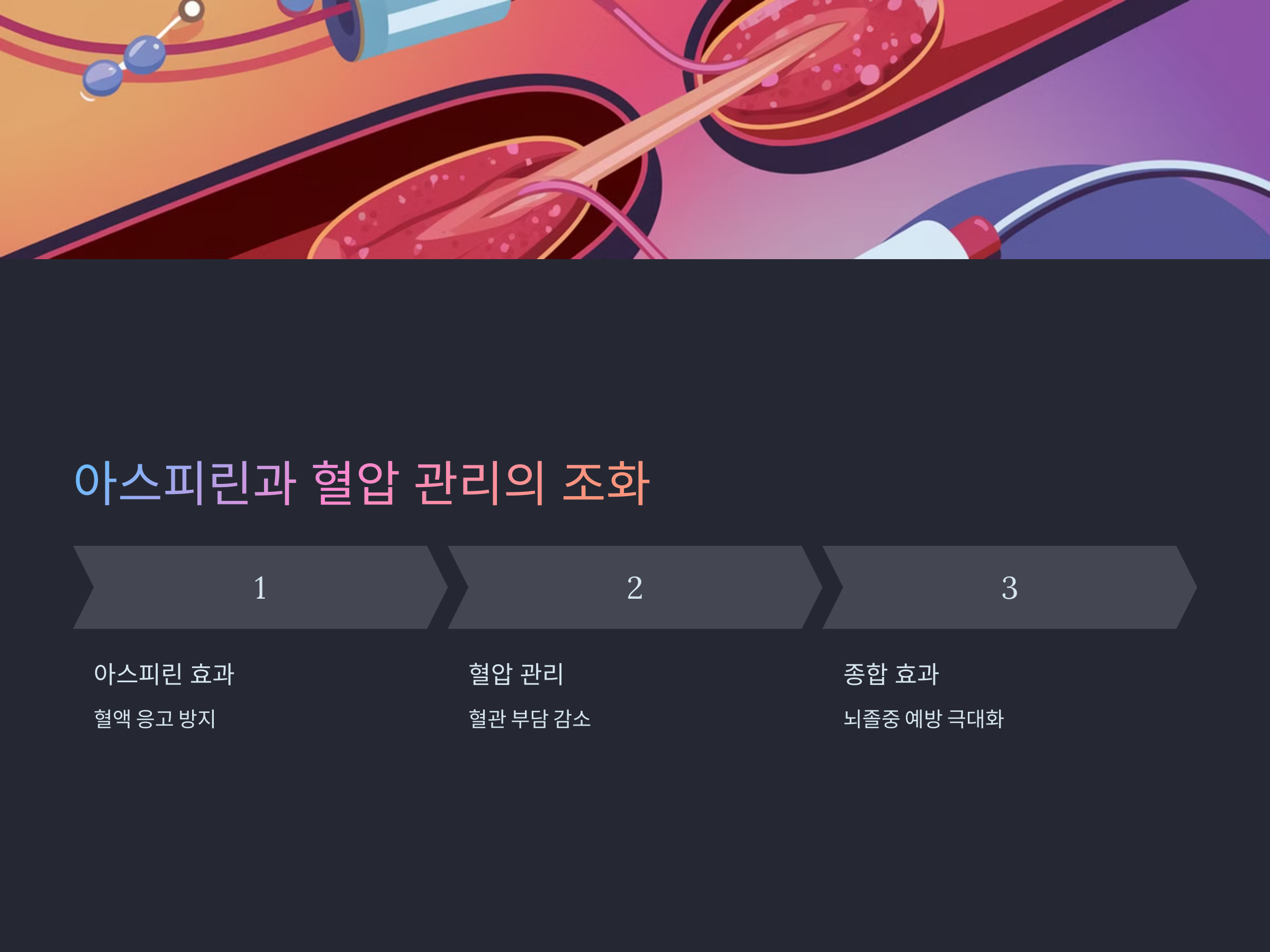 고혈압과 같은 심혈관 질환의 위험 요소를 관리하는 것이 뇌졸중 예방에 중요한 이유는 혈관에 미치는 영향 때문입니다. 고혈압이 지속되면 혈관 벽에 압력이 지속적으로 가해져 혈관이 약해지고, 이는 뇌졸중의 주요 원인이 될 수 있습니다. 아스피린은 혈액 응고를 예방하는 데 효과적인 약물이지만, 과다 복용 시 출혈 등의 부작용을 일으킬 수 있으므로 전문가의 지도 아래 복용해야 합니다.
