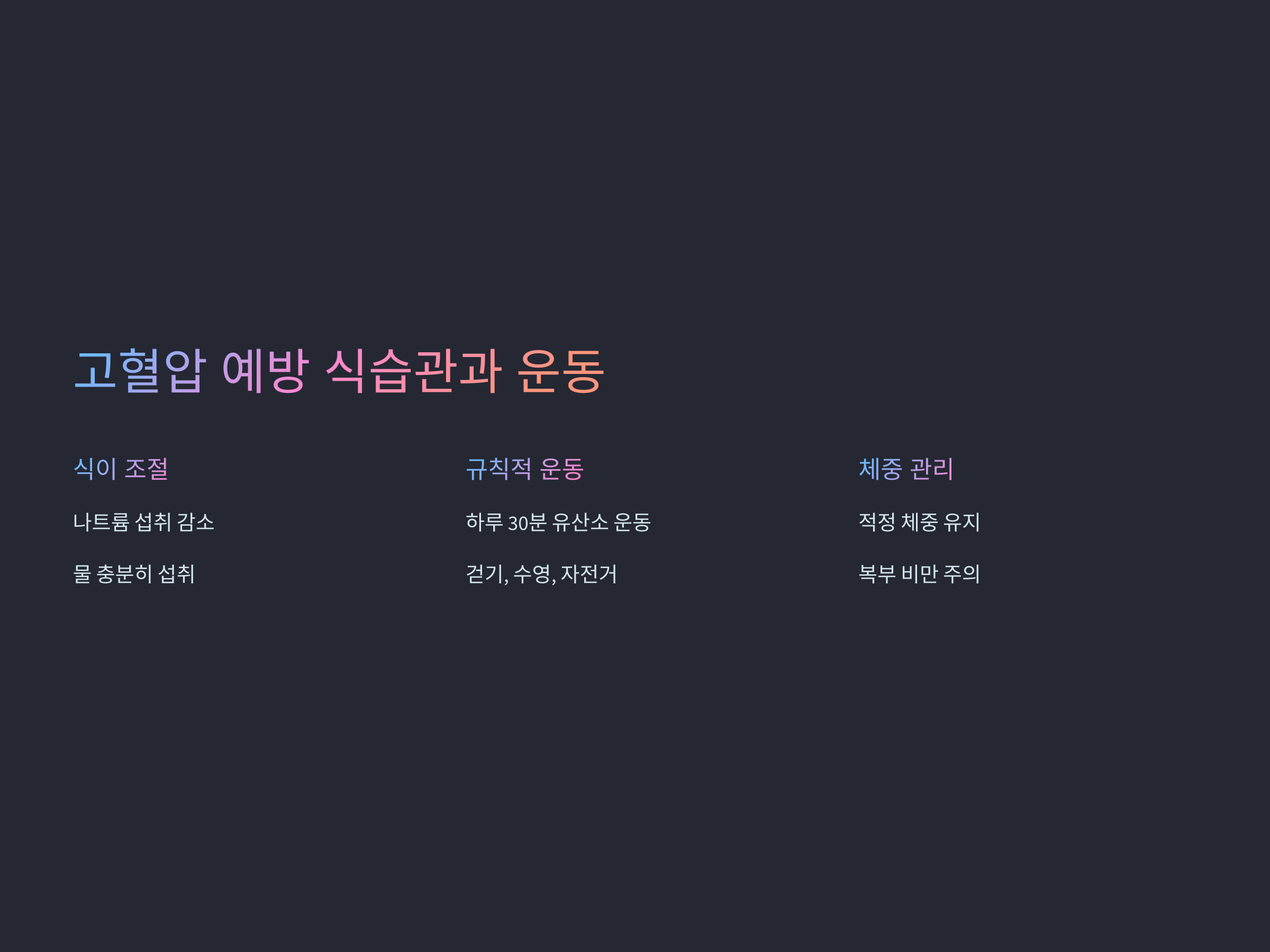 혈압을 관리하는 데 있어 중요한 역할을 하는 것은 바로 식습관과 운동입니다. 고혈압 예방을 위한 식사에서 중요한 점은 나트륨(소금) 섭취를 줄이는 것입니다. 나트륨은 체내에서 수분을 축적시켜 혈압을 상승시키므로, 염분이 적은 식단을 유지하는 것이 좋습니다.