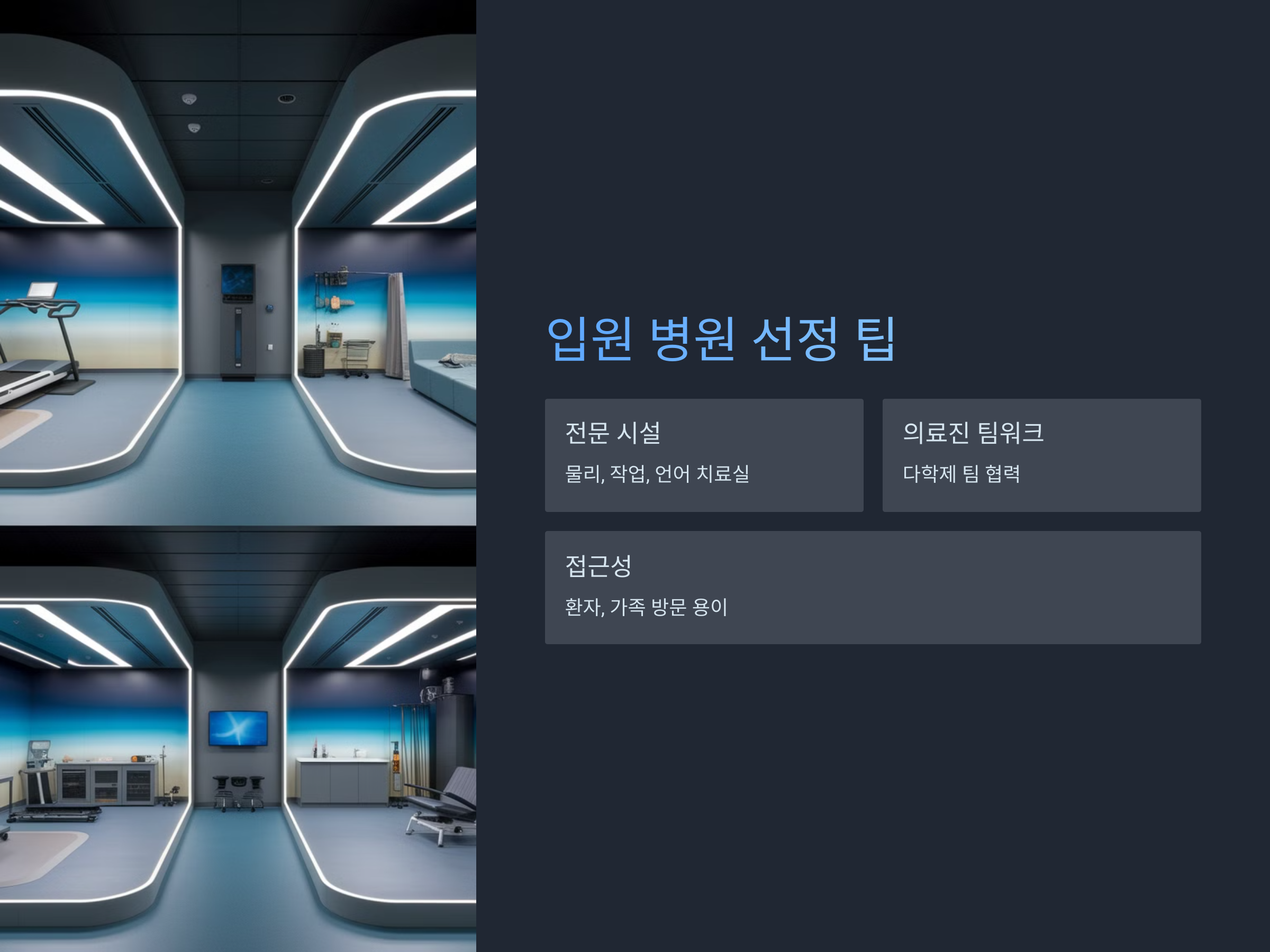 뇌졸중 후유증의 재활 치료는 주로 입원 치료를 통해 이루어지며, 병원 선택이 회복에 큰 영향을 미칩니다. 입원 재활 병원을 선택할 때 고려해야 할 몇 가지 중요한 팁은 다음과 같습니다: