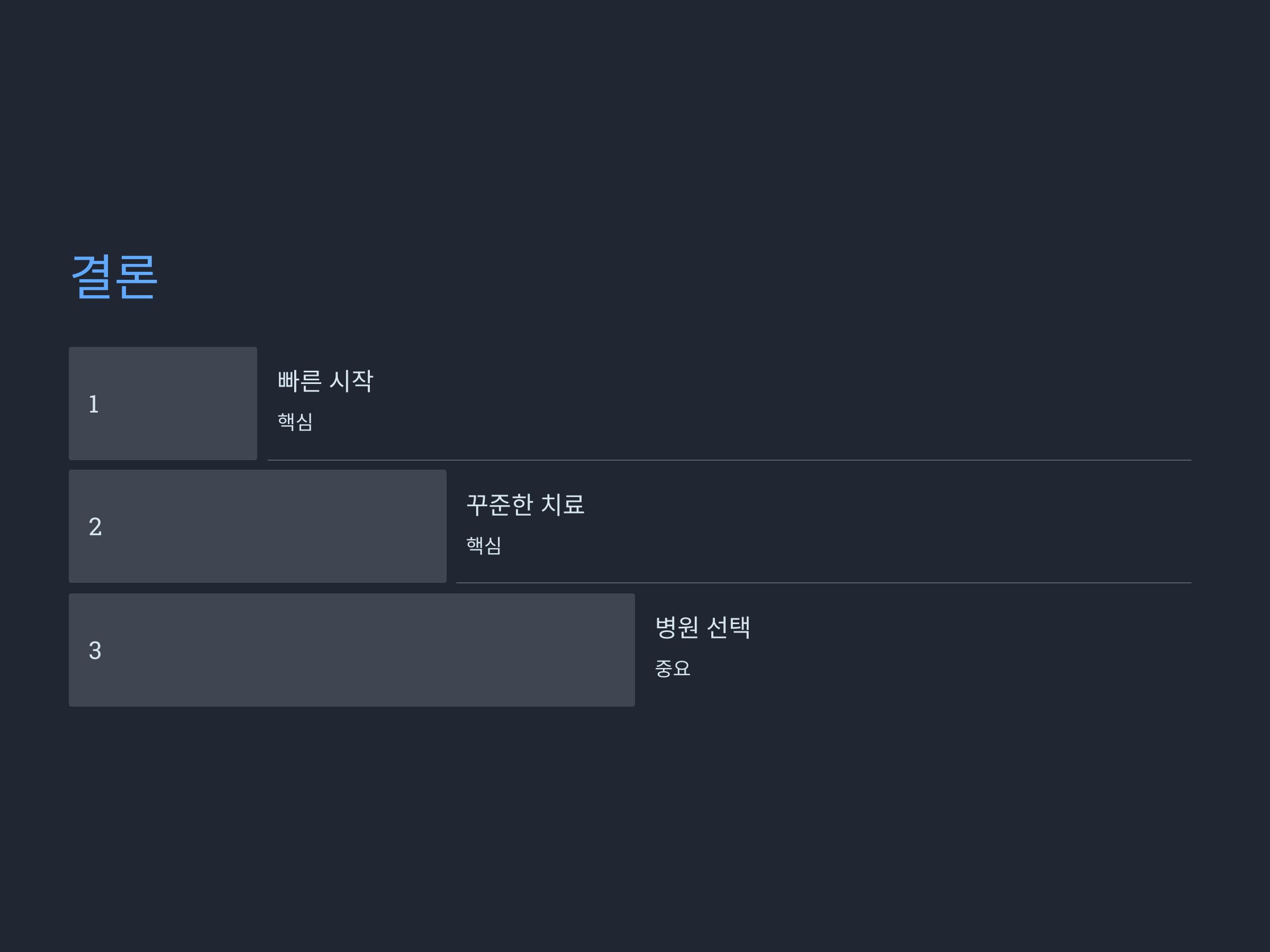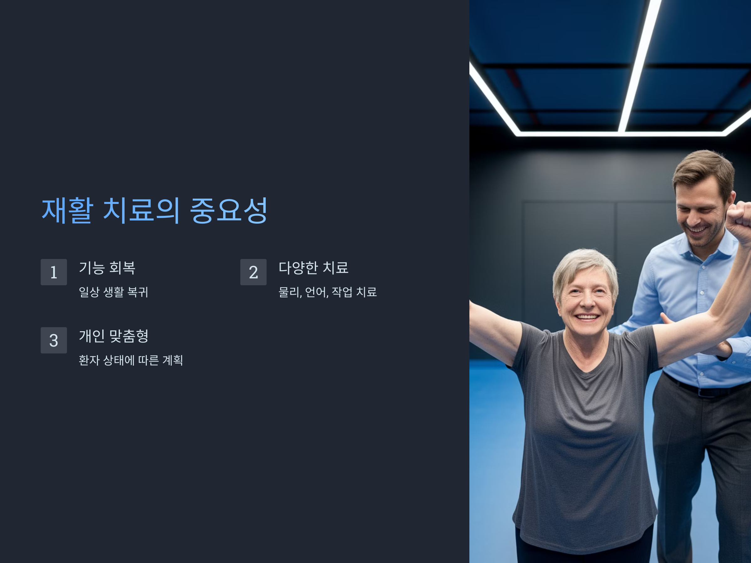 뇌졸중 후유증 재활 치료는 환자에게 중요한 회복의 기회를 제공합니다. 재활 병원 선정 시 적절한 시설과 전문가들이 있는 병원을 선택하고, 건강보험 급여 기준에 맞춰 치료를 받으면 경제적 부담을 줄일 수 있습니다. 빠른 치료와 적절한 재활로 건강한 삶을 회복할 수 있기를 바랍니다.