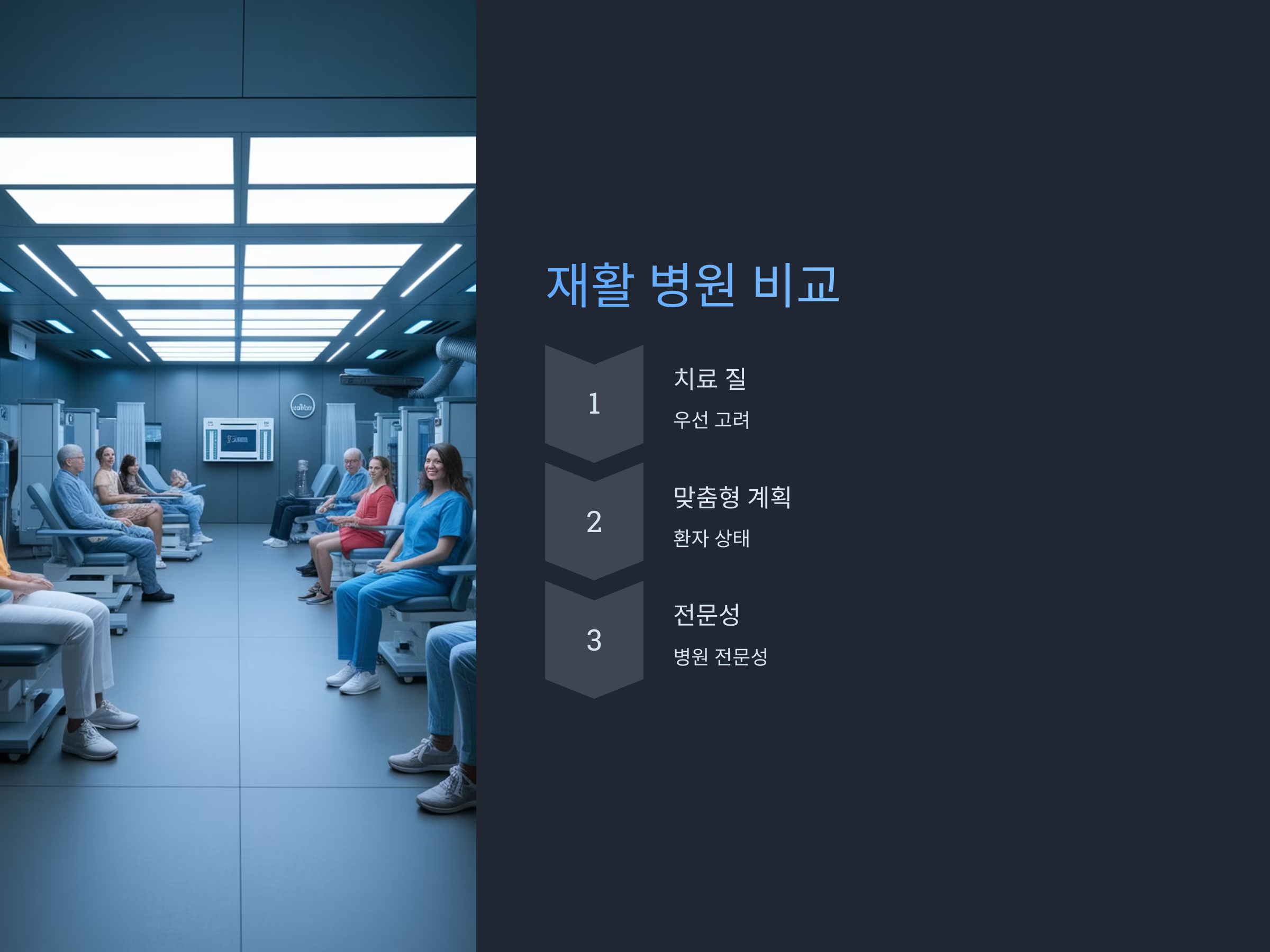 재활 치료 병원을 비교할 때는 단순히 비용만이 아니라 치료의 질을 우선적으로 고려해야 합니다. 환자의 상태에 맞는 맞춤형 치료 계획을 제공하는 병원과 병원의 전문성을 기준으로 선택하는 것이 중요합니다. 또한, 입원 치료 후 퇴원 후에도 외래 치료가 가능한 병원을 선택하는 것이 좋습니다.