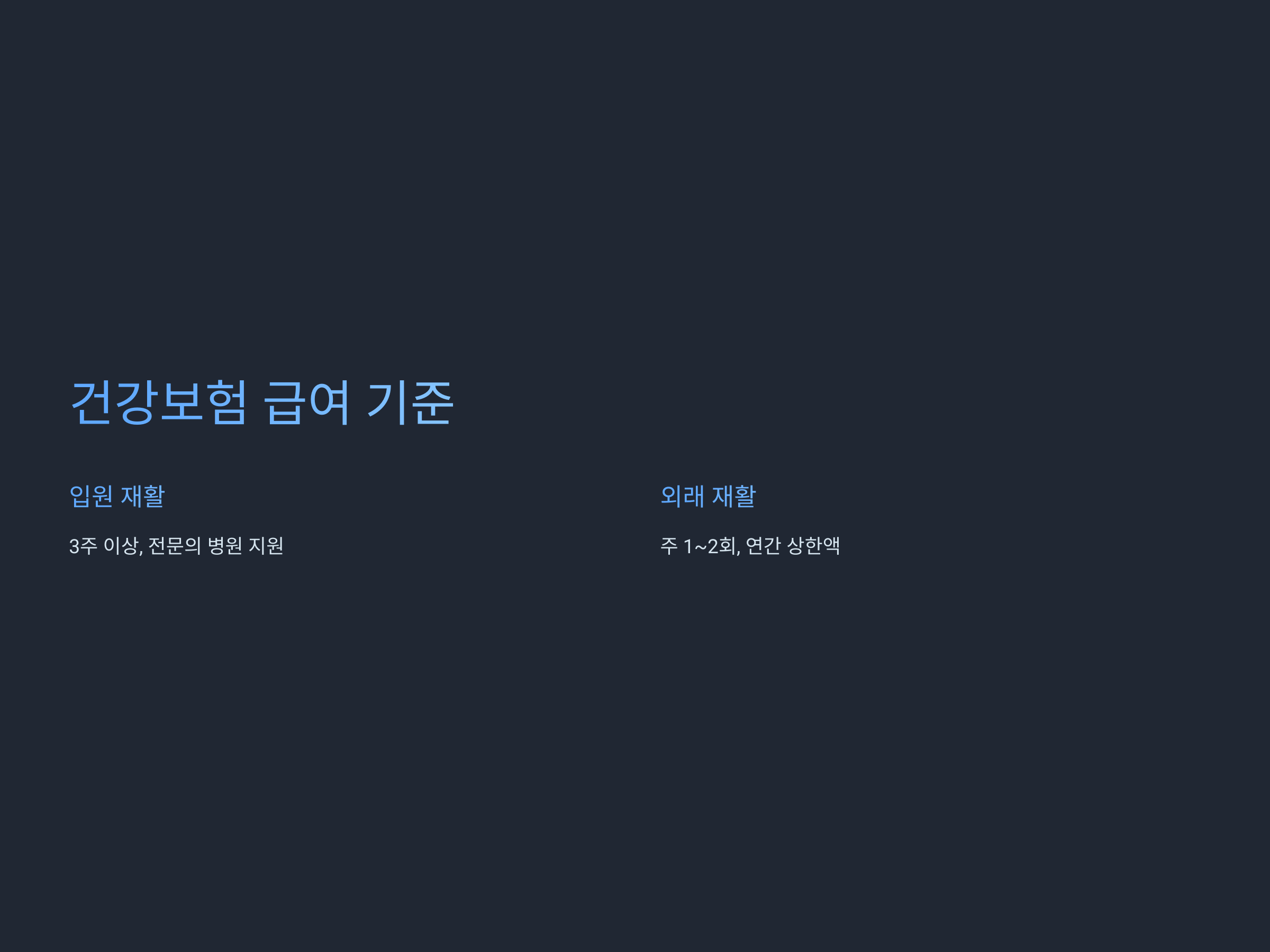- 입원 재활 치료: 3주 이상의 입원 치료 시 건강보험에서 지원, 일정 기간 이후 본인 부담금 발생.