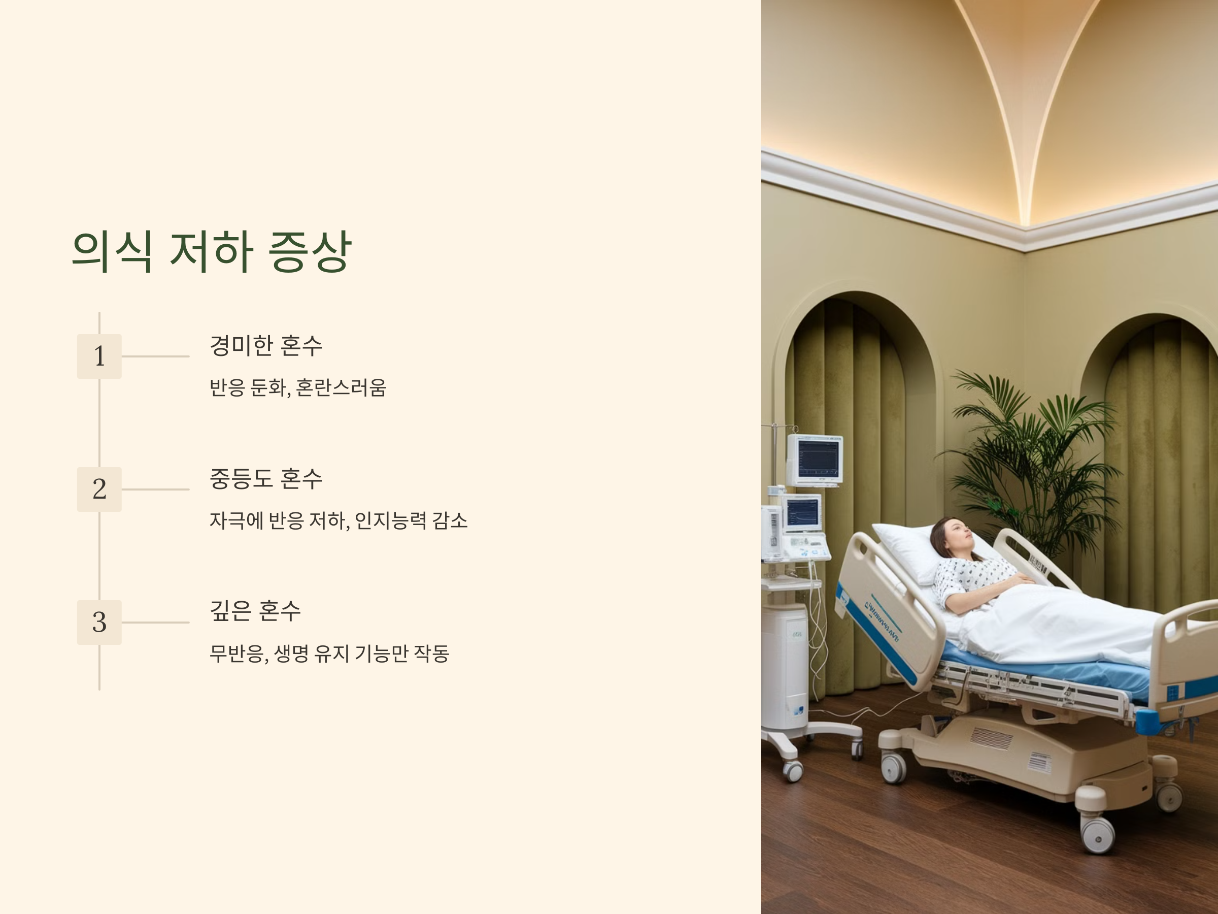뇌출혈이 발생한 후, 의식 저하는 매우 일반적인 증상입니다. 출혈이 뇌의 중요한 부분에 영향을 미치면 뇌 기능이 저하되어 의식이 흐려질 수 있습니다. 의식 저하는 여러 단계로 나뉘며, 경미한 혼수 상태에서부터 깊은 혼수 상태에 이르기까지 다양하게 나타날 수 있습니다. 특히, 뇌간 부위에서 출혈이 발생하면 의식 저하가 더욱 심각하게 나타날 수 있습니다.