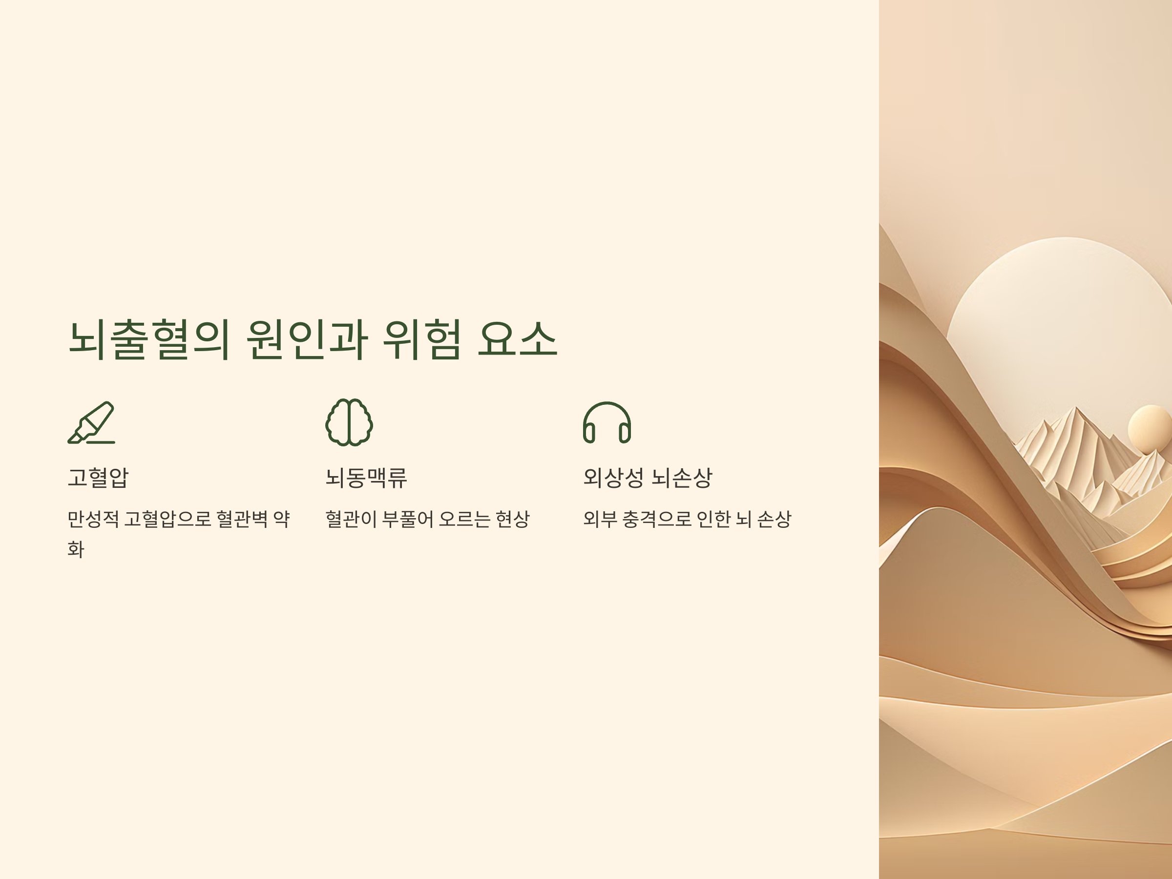 뇌출혈의 원인은 매우 다양하지만, 가장 일반적인 원인으로는 고혈압, 뇌동맥류 (혈관이 부풀어 오르는 현상), 외상성 뇌손상, 뇌혈관기형 등이 있습니다. 고혈압이 만성적으로 유지되면 혈관벽이 약해져 출혈이 발생할 수 있으며, 뇌동맥류나 뇌혈관기형도 출혈을 일으킬 수 있는 주요 원인입니다. 또한, 항응고제 사용이나 알콜 남용 또한 뇌출혈의 위험을 증가시킬 수 있습니다.