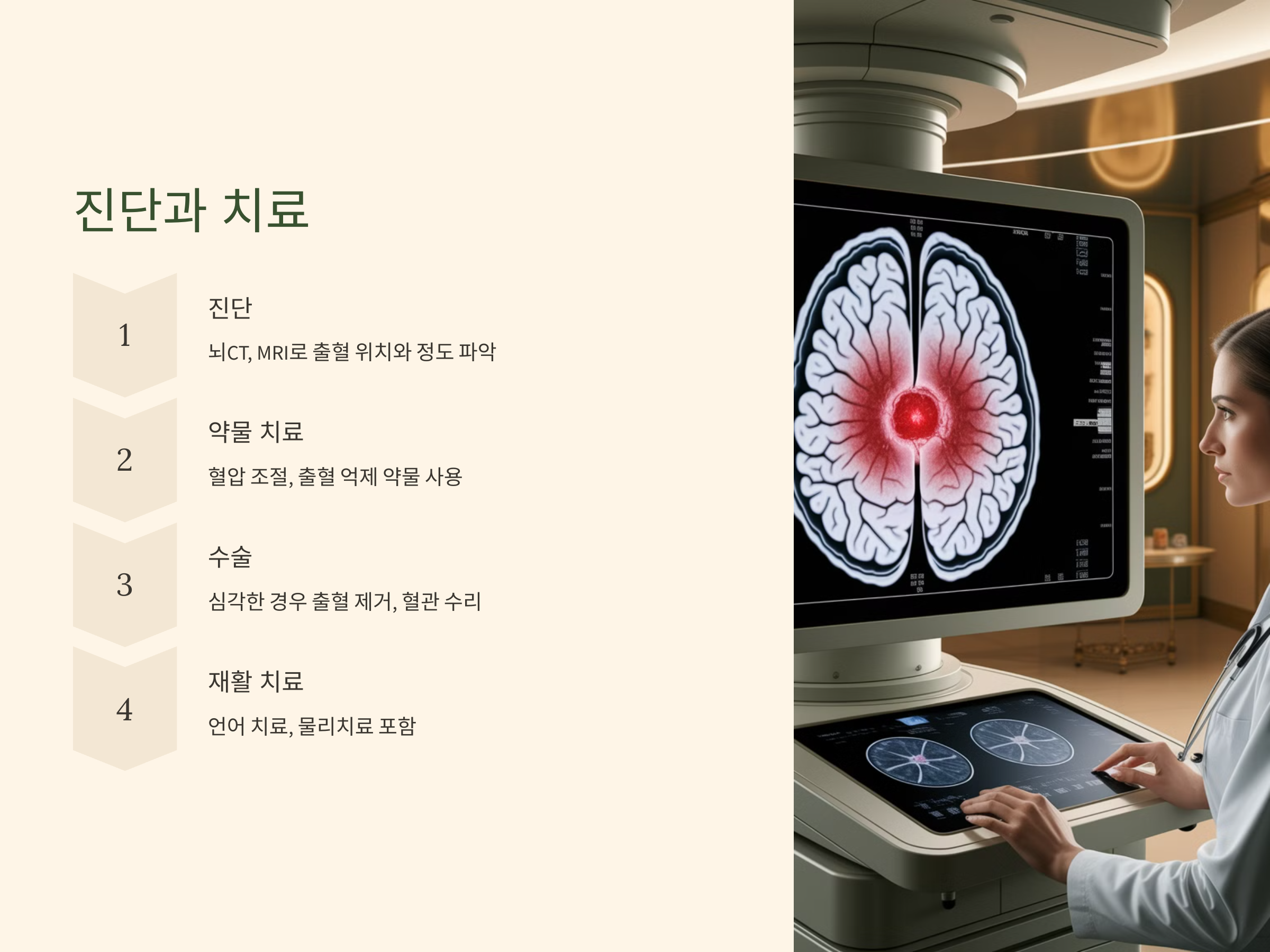 뇌출혈이 의심되는 경우, 즉시 뇌CT나 MRI 검사를 통해 출혈의 위치와 정도를 파악해야 합니다. 이러한 검사는 신속하게 뇌출혈을 확인하고, 이후의 치료 방향을 결정하는 데 중요한 역할을 합니다.